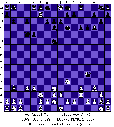 Last move : 1-0 2007 February 2 2:25:23 [Event "FICGS__BIG_CHESS__THOUSAND_MEMBERS_EVENT"] [Site "FICGS"] [Date "2006.12.05"] [Round "1"] [White "de Vassal,Thibault"] [Black "Melquiades,Jay"] [Result "1-0"] [WhiteElo ""] [BlackElo ""] 1.e2-e4 h15-g13 2.d2-d4 j15-k13 3.j2-h4 m15-m13 4.m2-m4 n15-n13 5.g1-f3 e15-e13 6.k1-l3 g15-g14 7.p2-p3 d15-d14 8.o1-p2 e13-e12 9.m1-m3 b15-b14 10.l1-o4 h16-d12 11.l3-k5 g13-h11 12.e1-e3 l16-o13 13.h1-o7 p15-p14 14.e3-c3 o16-b4 15.c3-c15 c16-g12 16.c15-f15 g12-h13 17.o7-n6 1-0 This big chess game has been lost on time (started : 2006.12.05 12:43:9) Follow this game move after move (download)The older I grow, the more I value pawns. (Paul Keres) Um dein Spiel zu verbessern musst du zuallererst das Endspiel studieren, denn diese kann unabhängig studiert werden. Die Eröffnung und das Mittelspiel müssen immer in Bezug gesetzt werden zum Endspiel. (José Raúl Capablanca) Fischer es una tragedia del Ajedrez Americano a la par con Morphy y Pillsbury. (Mig Greengard) Si rien de grave n'est détecté lors de l'analyse d'une position, on joue alors le coup. Seconde règle de Blumenfeld. Is not life a hundred times too short to bore ourselves ? (Friedrich Nietzsche)