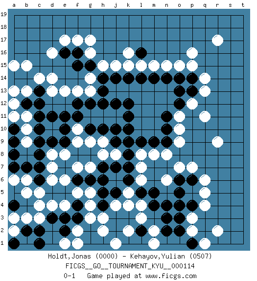 Last move : 0-1 2011 June 10 19:26:49 [Event "FICGS__GO__TOURNAMENT_KYU__000114"] [Site "FICGS"] [Date "2010.12.26"] [Round "1"] [Black "Holdt,Jonas"] [White "Kehayov,Yulian"] [Result "0-1"] [Rating 1 "0000"] [Rating 2 "0507"] 1.e11 q5 2.k11 p16 3.l14 g14 4.c9 d13 5.o14 q14 6.o13 k16 7.n3 c5 8.e3 c3 9.o5 p7 10.o4 p3 11.n4 g4 12.f3 g3 13.g2 h2 14.h1 j1 15.g1 f2 16.e2 f1 17.f4 f5 18.d3 d4 19.c2 b3 20.b2 a2 21.c1 e1 22.a1 a3 23.a4 c4 24.d5 d6 25.e5 e6 26.f6 g5 27.c6 e4 28.c7 f7 29.g6 g7 30.h6 e8 31.h5 j4 32.h4 h3 33.j5 k5 34.h7 h8 35.j7 j8 36.k7 l7 37.k8 l8 38.k9 l4 39.l9 m8 40.m9 n8 41.j9 h9 42.k10 p12 43.k6 l6 44.n9 o9 45.h10 g9 46.g10 f9 47.j10 f10 48.f11 o10 49.n10 d16 50.e10 n15 51.n14 l15 52.o12 o11 53.n11 o15 54.h14 h15 55.j14 j15 56.h13 g13 57.g12 f13 58.p13 q13 59.e9 d8 60.d9 d7 61.c8 r9 62.f12 e13 63.d11 b6 64.b7 a6 65.c13 c14 66.b14 b13 67.c12 b15 68.a14 a15 69.b12 a13 70.c11 r17 71.a7 b5 72.m4 l3 73.p4 q4 74.o3 p2 75.m5 n6 76.l2 k2 77.o6 o7 78.o2 m2 79.p6 q6 80.p1 q1 81.n2 m1 82.k14 k15 83.h12 r2 84.j12 m15 85.m14 q11 86.k12 a12 87.e16 e17 88.f16 f17 89.g15 g16 90.f15 d14 91.l5 k4 92.p14 p15 93.c10 a11 94.a10 b10 95.a9 b9 96.a8 b11 97.l16 g17 0-1 This go game has been lost on time (started : 2010.12.26 18:13:14) Here are the names of the openings (joseki) played in the four corners : Corner q16 : p16 l14 Takamoku (Gomok, Gaomu`) 5-4 Point. The takamoku (high) point (5-4). With its emphasis on influence, the 5-4 point complements the 4-4 (hoshi) point in creating an influence-oriented fuseki. Corner d16 : e11 g14 This joseki is unknown. A weak or weird move has probably been played in this corner. Corner q4 : q5 n3 Takamoku (Gomok, Gaomu`) 5-4 Point. The takamoku (high) point (5-4). With its emphasis on influence, the 5-4 point complements the 4-4 (hoshi) point in creating an influence-oriented fuseki. Corner d4 : c9 c5 This joseki is unknown. A weak or weird move has probably been played in this corner. Player White won this Go (weiqi, baduk) game. Follow this game move after move (download)Go is not a blocking game, it's a game of action. (Pierre Audouard) God is an atheist. (Unknown)