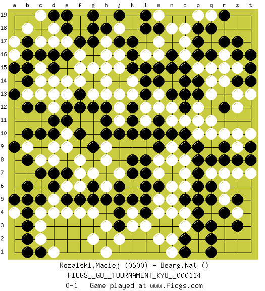 Last move : 0-1 2011 March 22 19:40:21 [Event "FICGS__GO__TOURNAMENT_KYU__000114"] [Site "FICGS"] [Date "2010.12.26"] [Round "1"] [Black "Rozalski,Maciej"] [White "Bearg,Nat"] [Result "0-1"] [Rating 1 "0600"] 1.q16 d4 2.c16 q4 3.j17 q10 4.d10 k4 5.n16 o6 6.k10 f15 7.e16 q14 8.d7 d13 9.c12 g7 10.c5 j16 11.k16 j15 12.k15 k14 13.l14 j13 14.f13 e14 15.e12 g15 16.g17 h15 17.k12 j12 18.j10 k13 19.l13 g13 20.g12 f14 21.h11 h14 22.e5 e4 23.f5 f4 24.g5 g4 25.j6 h8 26.k8 j7 27.k7 h6 28.h5 f8 29.g9 e9 30.f10 d8 31.e7 d9 32.c10 c8 33.c7 b9 34.b10 k6 35.j5 b7 36.b6 a6 37.a5 a7 38.a9 a4 39.b5 l12 40.k11 e13 41.f12 d5 42.d6 f6 43.g6 f7 44.b8 a8 45.b8 d12 46.d11 l11 47.l10 m12 48.o14 r16 49.r17 q15 50.p16 m13 51.m14 c15 52.b15 c14 53.b14 d17 54.d16 c17 55.b17 e17 56.f17 f18 57.g18 f19 58.g19 b18 59.e18 a17 60.b16 d18 61.e19 c13 62.b12 b13 63.a13 f16 64.d19 h17 65.h18 h16 66.k17 m10 67.m9 n9 68.p13 q13 69.n10 n11 70.o10 o11 71.o9 n8 72.p8 p10 73.p11 p12 74.o12 q11 75.n13 n12 76.o13 o8 77.m11 p11 78.m10 p15 79.o15 c19 80.p9 q7 81.p7 o7 82.p6 p5 83.k5 l6 84.l5 m5 85.m6 m4 86.l4 l3 87.j4 k3 88.b3 c3 89.b2 c2 90.b1 c4 91.b4 e6 92.j3 j2 93.h2 h3 94.l7 g2 95.r15 s15 96.s16 r14 97.s14 r16 98.t15 r15 99.s17 s13 100.t14 t13 101.t16 n6 102.q6 r6 103.q5 r5 104.q8 r7 105.r8 s9 106.r9 r10 107.s8 s10 108.p4 n5 109.o5 o4 110.p5 n4 111.p3 o3 112.r4 m7 113.l6 p2 114.q3 s4 115.s3 s7 116.t8 t7 117.r12 s12 118.t9 t10 119.s5 m8 120.l8 m2 121.q2 p1 122.q1 o17 123.p18 o18 124.p17 n18 125.m18 m17 126.l18 m16 127.m15 j11 128.h12 h13 129.d15 h1 130.o2 n2 131.o1 n1 132.c1 d1 133.p14 e10 134.e11 o16 135.n15 l16 136.l15 p19 137.q18 j18 138.j19 m19 139.l19 q19 140.r19 a16 141.a15 h9 142.h10 d14 143.pass pass 0-1 Comment by player 1 : Maciej Rozalski : it's not a ko. Comment by player 2 : Nat Bearg : Ummmmmmm, rule of Ko? you can't go there this turn. Here are the names of the openings (joseki) played in the four corners : Corner d4 : d4 d7 Hoshi (Hwajeom, Seongjeom, Xingwei`) 4-4 Point. The star or hoshi (4-4) point, emphasizing influence at the potential expense of territory. Niken Takagakari (Dukan Nop'dakeolch'im, E`r Gaojia, 2-Space High Approach). Black 2 is a light approach move. Rarely played in even games, Black 2 is typically employed in handicap games. White continues with 6-4 or 3-10. In Korean Sunjang Baduk White has a stone on 8-4. Player White won this Go (weiqi, baduk) game. Follow this game move after move (download)If your stone is capped, play the knight's move. (Anonymous) The greatest con, that he ever pulled... was making you believe... that he is you. (Revolver, movie)