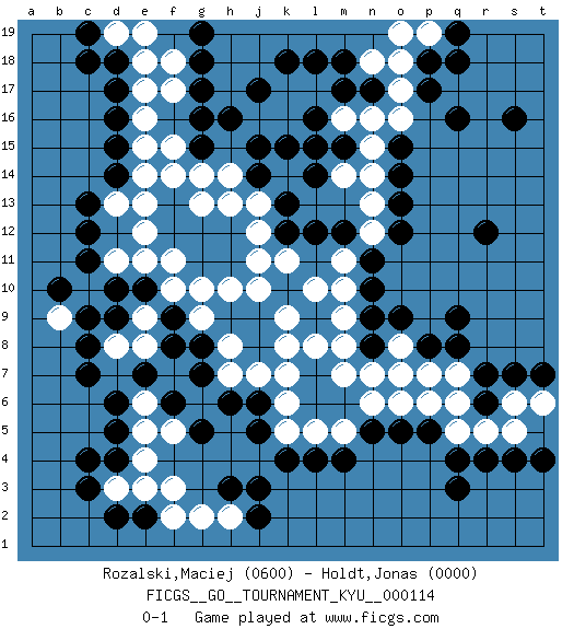 Last move : 0-1 2011 May 23 18:43:37 [Event "FICGS__GO__TOURNAMENT_KYU__000114"] [Site "FICGS"] [Date "2010.12.26"] [Round "1"] [Black "Rozalski,Maciej"] [White "Holdt,Jonas"] [Result "0-1"] [Rating 1 "0600"] [Rating 2 "0000"] 1.q16 f14 2.q3 j10 3.q9 l8 4.d4 h10 5.d17 e16 6.d16 e15 7.d15 e14 8.d14 e13 9.l16 h13 10.h16 g13 11.o15 e12 12.c7 d13 13.c13 q6 14.p5 p6 15.o5 o6 16.n9 m8 17.n8 n7 18.q8 n6 19.n5 m7 20.k4 m9 21.n11 m10 22.n10 l10 23.l12 k9 24.j14 j13 25.k13 j12 26.k12 j11 27.d10 d11 28.c11 e11 29.e10 f10 30.f9 g9 31.f8 k7 32.j6 j7 33.h6 h7 34.g7 f7 35.g8 g6 36.f6 e9 37.d9 e8 38.e7 d8 39.c8 h14 40.j15 h8 41.g5 c10 42.c9 b9 43.b10 e17 44.g17 e18 45.d18 k11 46.s16 m5 47.m4 l5 48.l4 k5 49.j5 p7 50.r7 k6 51.p8 q7 52.r6 q5 53.q4 r5 54.r4 s5 55.s4 s6 56.s7 t6 57.t7 f18 58.g18 g14 59.c12 f11 60.g19 d19 61.c19 e19 62.c18 o17 63.p17 o16 64.n17 n16 65.m17 m16 66.m15 o18 67.p18 n18 68.m18 p19 69.q19 o19 70.q18 n15 71.l15 n14 72.o14 n13 73.o13 m11 74.m12 n12 75.o12 l17 76.l18 k17 77.k18 k16 78.k15 m14 79.l14 j16 80.j17 g2 81.e2 o8 82.o9 o7 83.r12 f2 84.j2 f17 85.g15 f15 86.t4 k8 87.g16 g10 88.pass e3 89.d2 d3 90.c3 f3 91.h3 e4 92.c4 e5 93.d5 h2 94.j3 e6 95.d6 f5 0-1 Here are the names of the openings (joseki) played in the four corners : Corner d16 : f14 d17 This joseki is unknown. A weak or weird move has probably been played in this corner. Player White won this Go (weiqi, baduk) game. Follow this game move after move (download)If there is no stone on the handicap point, the carpenter's square is dead. (Anonymous) I don't know, I don't care, and it doesn't make any difference. (Albert Einstein)