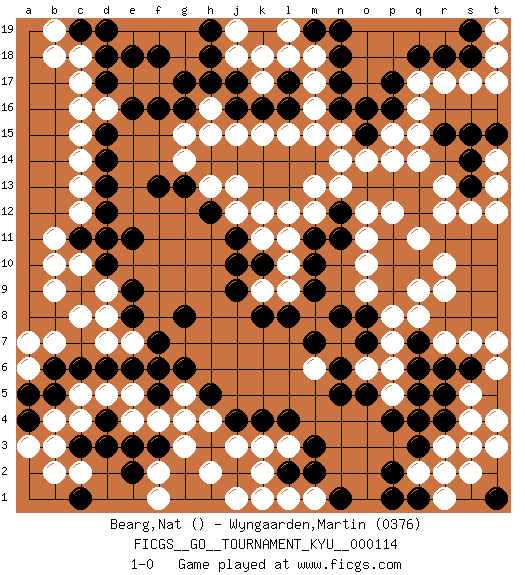 Last move : 1-0 2011 April 20 4:27:17 [Event "FICGS__GO__TOURNAMENT_KYU__000114"] [Site "FICGS"] [Date "2010.12.26"] [Round "1"] [Black "Bearg,Nat"] [White "Wyngaarden,Martin"] [Result "1-0"] [Rating 2 "0376"] 1.d4 q16 2.q4 d16 3.k16 q9 4.k4 k17 5.d10 c13 6.q13 r10 7.k10 q8 8.p10 q11 9.q7 c10 10.c11 b10 11.d12 b11 12.d15 c15 13.e16 k3 14.e11 j3 15.j4 l3 16.l4 h4 17.h5 g4 18.f5 f4 19.e3 r13 20.q12 r12 21.o16 p15 22.o15 p14 23.p13 o14 24.o13 n14 25.m14 n13 26.n12 m13 27.l13 m12 28.m11 l12 29.k13 l11 30.m10 o12 31.n11 p12 32.p9 p8 33.o8 p7 34.q6 n15 35.n16 m15 36.l14 e17 37.f16 f17 38.g17 p6 39.q5 m16 40.n17 m17 41.n18 m18 42.p17 q17 43.q18 r17 44.r18 s17 45.s18 t18 46.s19 t17 47.m19 l19 48.n19 l18 49.m3 t19 50.j17 j18 51.h18 j19 52.h19 r7 53.r6 s7 54.s6 t6 55.t5 t7 56.q10 r9 57.l16 s5 58.l17 k18 59.d17 c16 60.e18 c17 61.d18 c18 62.f18 o6 63.n6 n7 64.o7 m6 65.n5 o9 66.p11 q14 67.n8 o11 68.m7 o10 69.g8 c12 70.c9 d11 71.d14 c14 72.d13 b9 73.c11 c8 74.d11 d9 75.e9 d8 76.e8 d7 77.e6 g5 78.g6 l10 79.m9 l9 80.l8 k9 81.j9 k11 82.j10 j12 83.h12 j13 84.j14 h13 85.j11 k12 86.g13 l15 87.k14 k15 88.j16 j15 89.h14 g14 90.h15 h16 91.h17 g15 92.f13 e5 93.f6 d5 94.d6 c5 95.c6 c4 96.c3 e4 97.d3 b3 98.f3 g3 99.g2 h2 100.h1 j1 101.g1 f2 102.k1 f1 103.e2 c2 104.c1 b2 105.l2 s4 106.s3 r3 107.r2 s2 108.q3 t3 109.r4 s3 110.k8 q2 111.p2 r1 112.p1 k2 113.q1 r2 114.t1 t4 115.s14 t14 116.s15 t13 117.r15 l1 118.m2 m1 119.n1 k1 120.p16 q15 121.g16 h15 122.b5 b4 123.r5 b7 124.b6 a7 125.a4 a6 126.a5 a3 127.s13 s12 128.c19 b19 129.d19 b18 130.t15 t12 131.o5 p5 132.p4 e7 133.f7 pass 134.pass 1-0 Here are the names of the openings (joseki) played in the four corners : Corner q4 : q4 q9 Hoshi (Hwajeom, Seongjeom, Xingwei`) 4-4 Point. The star or hoshi (4-4) point, emphasizing influence at the potential expense of territory. Corner q16 : q16 q13 Hoshi (Hwajeom, Seongjeom, Xingwei`) 4-4 Point. The star or hoshi (4-4) point, emphasizing influence at the potential expense of territory. Niken Takagakari (Dukan Nop'dakeolch'im, E`r Gaojia, 2-Space High Approach). Black 2 is a light approach move. Rarely played in even games, Black 2 is typically employed in handicap games. White continues with 6-4 or 3-10. In Korean Sunjang Baduk White has a stone on 8-4. Corner d4 : d4 j3 Hoshi (Hwajeom, Seongjeom, Xingwei`) 4-4 Point. The star or hoshi (4-4) point, emphasizing influence at the potential expense of territory. Player Black won this Go (weiqi, baduk) game. Follow this game move after move (download)In opponents' sphere of influence, avoid sharp conflict, don't move too deep. (Otake Hideo, 9p) They misunderestimated me. (George W. Bush, Bentonville nov. 6, 2000)