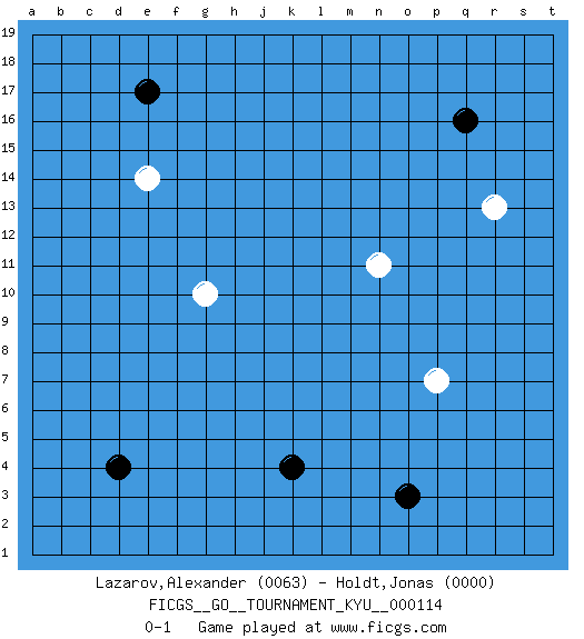 Last move : 0-1 2011 February 15 10:35:52 [Event "FICGS__GO__TOURNAMENT_KYU__000114"] [Site "FICGS"] [Date "2010.12.26"] [Round "1"] [Black "Lazarov,Alexander"] [White "Holdt,Jonas"] [Result "0-1"] [Rating 1 "0063"] [Rating 2 "0000"] 1.q16 g10 2.d4 p7 3.k4 n11 4.o3 e14 5.e17 r13 0-1 This go game has been lost on time (started : 2010.12.26 18:13:14) Here are the names of the openings (joseki) played in the four corners : Corner q16 : q16 n11 Hoshi (Hwajeom, Seongjeom, Xingwei`) 4-4 Point. The star or hoshi (4-4) point, emphasizing influence at the potential expense of territory. Corner q4 : p7 o3 This joseki is unknown. A weak or weird move has probably been played in this corner. Corner d16 : e14 e17 This joseki is unknown. A weak or weird move has probably been played in this corner. Player White won this Go (weiqi, baduk) game. Follow this game move after move (download)There is death in the hane. (Anonymous) They say poker is a zero-sum game. It must be, because every time I play my sum ends up zero. (Max Shapiro)