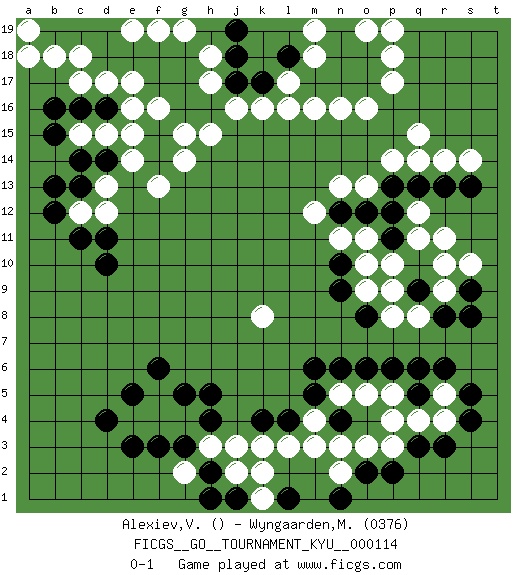 Last move : 0-1 2011 May 18 18:18:15 [Event "FICGS__GO__TOURNAMENT_KYU__000114"] [Site "FICGS"] [Date "2010.12.26"] [Round "1"] [Black "Alexiev,Valeri"] [White "Wyngaarden,Martin"] [Result "0-1"] [Rating 2 "0376"] 1.f6 q15 2.f15 q4 3.d10 j16 4.r3 r4 5.q3 f5 6.e5 f4 7.e3 e4 8.d4 k3 9.g5 g4 10.h4 h3 11.h5 r11 12.g3 f16 13.f3 p3 14.p2 o3 15.o2 n2 16.s4 r5 17.s5 d15 18.c16 c15 19.d16 e14 20.e15 e16 21.g16 g15 22.f14 f13 23.b15 g14 24.d14 d13 25.c14 e15 26.c13 c12 27.b13 d12 28.b12 n16 29.g17 h17 30.f17 e17 31.h16 h15 32.g18 h18 33.e18 d17 34.d18 c17 35.b16 c18 36.c19 b18 37.b19 a18 38.d19 g19 39.f18 f19 40.j19 a19 41.j18 e19 42.j17 k16 43.k17 l17 44.m17 m16 45.l18 l16 46.n17 o16 47.o17 p17 48.c11 p18 49.o18 o19 50.n19 p19 51.r6 p5 52.q6 m12 53.m6 m19 54.n18 m18 55.q5 p4 56.p6 o5 57.o6 n5 58.m5 m4 59.l4 l3 60.n4 m3 61.n6 n3 62.k4 j3 63.h2 j2 64.j1 k1 65.h1 k8 66.l1 k2 67.n1 g2 68.d11 p8 69.o8 o9 70.n9 o10 71.n10 n11 72.p9 p10 73.q9 q8 74.q10 q11 75.p11 o11 76.p12 r9 77.r8 r10 78.q9 p9 79.s9 s10 80.s8 q12 81.o12 o13 82.n12 n13 83.p13 p14 84.q13 q14 85.r13 r14 86.s13 s14 0-1 Here are the names of the openings (joseki) played in the four corners : Corner d16 : f15 j16 This joseki is unknown. A weak or weird move has probably been played in this corner. Corner q4 : q4 r3 Hoshi (Hwajeom, Seongjeom, Xingwei`) 4-4 Point. The star or hoshi (4-4) point, emphasizing influence at the potential expense of territory. Corner d4 : f6 f5 This joseki is unknown. A weak or weird move has probably been played in this corner. Player White won this Go (weiqi, baduk) game. Follow this game move after move (download)The L-group is dead. (Anonymous) Good luck. You're gonna need it. (Han Solo in Star Wars ep.6)