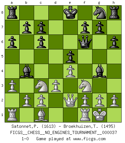 Last move : 1-0 2011 March 12 23:52:0 [Event "FICGS__CHESS__NO_ENGINES_TOURNAMENT__000037"] [Site "FICGS"] [Date "2010.12.26"] [Round "1"] [White "Satonnet,Patrick"] [Black "Broekhuizen,Tom"] [Result "1-0"] [WhiteElo "1613"] [BlackElo "1495"] 1.e4 e5 2.Nf3 Nc6 3.Bb5 a6 4.Bxc6 dxc6 5.O-O Qf6 6.d3 h6 7.Nc3 Bg4 8.Qe2 Bb4 9.a3 1-0 This chess game has been lost on time (started : 2010.12.26 22:39:43) Ruy Lopez : Exchange variation, 5.O-O Kingside Castling by player White (move 5) Player White won this chess game. Follow this game move after move (download)A sacrifice is best refuted by accepting it. (Wilhelm Steinitz) Der Umstand, daß uns eine 7 Stunden Zeitkontrolle ermöglicht eine großartige, tiefe Partie zu spielen, ist für die Massenmedien nicht weiter von Bedeutung. (Alexej Shirov) La captura del Rey enemigo es la finalidad pero no el primer objetivo de la partida. (William Steinitz) Dans le domaine de la peinture, de la gravure et de la sculpture, dès la première décennie de notre siècle, les artistes abandonnent la représentation de la partie d'échecs pour se concentrer sur les pièces, sur les échiquiers et sur toutes les variations auxquelles les unes et les autres peuvent donner lieu. On passe en quelque sorte d'un thème social à un thème musical (au sens de la musica médiévale, c'est-à-dire d'une notion qui inclue le rythme, l'harmonie, la construction et la déconstruction, etc.). Graphiquement et picturalement, l'échiquier apparaît comme une structure ouverte, dynamique, d'une richesse infinie, autorisant toutes les combinatoires et débouchant sur des mouvements et des rythmes de nature exponentielle. (Michel Pastoureau) Imagination is more important than knowledge. Knowledge is limited. Imagination encircles the world. (Albert Einstein)