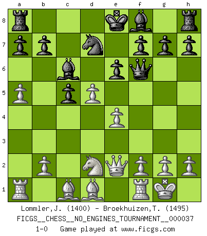 Last move : 1-0 2011 January 15 13:21:14 [Event "FICGS__CHESS__NO_ENGINES_TOURNAMENT__000037"] [Site "FICGS"] [Date "2010.12.26"] [Round "1"] [White "Lommler,Jan Peter"] [Black "Broekhuizen,Tom"] [Result "1-0"] [WhiteElo "1400"] [BlackElo "1495"] 1.d4 d5 2.c4 c6 3.Nf3 Nf6 4.Nc3 dxc4 5.a4 Bf5 6.e3 e6 7.Bxc4 Nbd7 8.Qe2 Nb6 9.Bb3 Ne4 10.Nxe4 Bxe4 11.O-O Qf6 12.Nd2 Bd5 13.a5 Nd7 14.Bd1 c5 15.e4 Bc6 16.d5 1-0 QGD Slav : Dutch variation Kingside Castling by player White (move 11) Player White won this chess game. Follow this game move after move (download)The defensive power of a pinned piece is only imaginary. (Aaron Nimzovich) Frage: Wie viele Autos haben Sie schon zerstört? - Antwort: Nur zwei. (Loek van Wely) El Ajedrez es un terrible juego. Si no controlas el centro, tu oponente tiene una posición mas holgada. Si tienes control del centro, ¡entonces realmente tu tienes algo de que preocuparte!. (Siegbert Tarrasch) Ce n'est pas pour s'amuser qu'il joue aux échecs : il célèbre un culte. (Vladimir Nabokov) Thibault, I ask for draw. Game 13876. - Sorry Ilmars, you won. (FICGS chat)