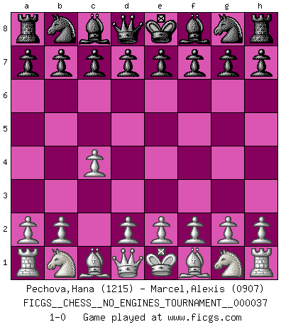 Last move : 1-0 2010 December 30 8:24:54 [Event "FICGS__CHESS__NO_ENGINES_TOURNAMENT__000037"] [Site "FICGS"] [Date "2010.12.26"] [Round "1"] [White "Pechova,Hana"] [Black "Marcel,Alexis"] [Result "1-0"] [WhiteElo "1215"] [BlackElo "0907"] 1.c4 1-0 English Opening Player White won this chess game. Follow this game move after move (download)I like the moment when I break a man's ego. (Bobby Fischer) Unter Putin wird alles Geld aus Russland wie von einem Staubsauger nach Moskau umgeleitet, das ist wie ein schwarzes Loch. (Garry Kasparov) Para mi, el Ajedrez es la vida y cada partida es como una nueva vida. Todo jugador de Ajedrez suele vivir muchas vidas durante su vida. (Eduard Gufeld) Avec des compensations pour le matériel en plus... (Anonyme) Locking firmely the window serves nothing, only small thiefs pass through there, the big thiefs enter through the front door. (Luc-Olivier Leclerc)