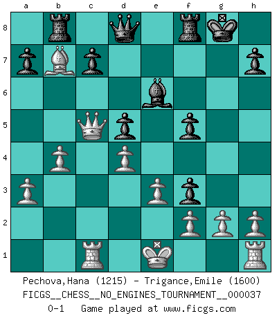 Last move : 0-1 2011 April 7 2:58:16 [Event "FICGS__CHESS__NO_ENGINES_TOURNAMENT__000037"] [Site "FICGS"] [Date "2010.12.26"] [Round "1"] [White "Pechova,Hana"] [Black "Trigance,Emile"] [Result "0-1"] [WhiteElo "1215"] [BlackElo "1600"] 1.d4 Nf6 2.c4 Nc6 3.Nf3 e6 4.Nc3 Bb4 5.e3 d6 6.Bd2 O-O 7.Qc2 d5 8.a3 Bxc3 9.Bxc3 Ne4 10.Bd3 f5 11.b4 Nxc3 12.Qxc3 Bd7 13.cxd5 exd5 14.Qc5 Be6 15.Rc1 g5 16.Bb5 g4 17.Bxc6 gxf3 18.Bxb7 Rb8 0-1 This chess game has been lost on time (started : 2010.12.26 22:39:43) Kevitz-Trajkovich defense Kingside Castling by player Black (move 6) Player Black won this chess game. Follow this game move after move (download)Excellence at Chess is one mark of a scheming mind. (Sir Arthur Conan Doyle) Bis jetzt ist Weiß einer wohlbekannten Analyse gefolgt. Aber jetzt begeht er einen schrecklichen Fehler: Er beginnt seinen eigenen Kopf zu benutzen. (Siegbert Tarrasch) La captura del Rey enemigo es la finalidad pero no el primer objetivo de la partida. (William Steinitz) Toutes les manuvres exécutées sur une colonne ouverte ont pour but ultime l'intrusion définitive sur la septième ou la huitième rangée, en plein cur de la position ennemie. (Aaron Nimzovitch) When the going gets tactical, the computers get going. (Hyatt)