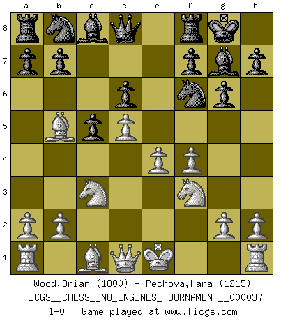 Last move : 1-0 2011 February 19 10:45:58 [Event "FICGS__CHESS__NO_ENGINES_TOURNAMENT__000037"] [Site "FICGS"] [Date "2010.12.26"] [Round "1"] [White "Wood,Brian"] [Black "Pechova,Hana"] [Result "1-0"] [WhiteElo "1800"] [BlackElo "1215"] 1.d4 Nf6 2.c4 c5 3.d5 e6 4.Nc3 exd5 5.cxd5 d6 6.e4 g6 7.f4 Bg7 8.Nf3 O-O 9.Bb5 1-0 This chess game has been lost on time (started : 2010.12.26 22:39:43) Benoni : pawn storm variation Kingside Castling by player Black (move 8) Player White won this chess game. Follow this game move after move (download)Via the squares on the chessboard, the Indians explain the movement of time and the age, the higher influences which control the world and the ties which link Chess with the human soul. (Al-Masudi) Der zweitbeste Zug ist oft der einzig richtige. (Savielly Grigorievitsch Tartakower) La vida es como el Ajedrez, con lucha, competición y eventos buenos y malos. (Benjamin Franklin) Ce qui caractérise les parties de combat, c'est que si le défenseur a constamment de difficiles problèmes à résoudre, l'attaquant doit chercher sans relâche de nouvelles possibilités d'attaque. (Koblentz) Hold em is to stud what chess is to checkers. (Johnny Moss)