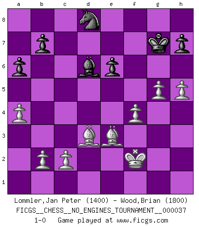 Last move : 1-0 2011 February 4 3:20:37 [Event "FICGS__CHESS__NO_ENGINES_TOURNAMENT__000037"] [Site "FICGS"] [Date "2010.12.26"] [Round "1"] [White "Lommler,Jan Peter"] [Black "Wood,Brian"] [Result "1-0"] [WhiteElo "1400"] [BlackElo "1800"] 1.e4 d6 2.d4 Nf6 3.Nc3 g6 4.f4 Bg7 5.Nf3 O-O 6.Bd3 c5 7.dxc5 dxc5 8.Qe2 Bg4 9.e5 Nd5 10.Nxd5 Qxd5 11.Be4 Qd7 12.Be3 Rc8 13.O-O f5 14.Rfd1 Qc7 15.Bd5+ Kf8 16.Qb5 Nc6 17.Be6 Bxf3 18.gxf3 Rd8 19.Qxc5 Rxd1+ 20.Rxd1 Rd8 21.Rxd8+ Qxd8 22.Kf2 a6 23.a4 g5 24.fxg5 Bxe5 25.f4 Qd6 26.Qxd6 Bxd6 27.h4 Kg7 28.h5 Nd8 29.Bxf5 e6 30.Bd3 1-0 Pirc : Austrian attack, 6.Bd3 Kingside Castling by player Black (move 5) Kingside Castling by player White (move 13) Player White won this chess game. Follow this game move after move (download)Do you realize Fischer almost never has any bad pieces? He exchanges them, and the bad pieces remain with his opponents. (Yuri Balashov) Ich erzeugte keinen Neid, da mich die Schachspieler als Musiker und die Musiker als Schachspieler betrachteten. (Mark Taimanov) Yo siempre he tenido un ligero sentimiento de lástima por una persona que no tiene conocimiento del Ajedrez. (Siegbert Tarrasch) Lorsque vous vous retrouvez devant une position atroce, ne tendez pas un ultime piège dérisoire avec l'intention d'abandonner si l'adversaire le déjoue ! Faites-vous plutôt un devoir de résister comme si votre vie en dépendait. Jouez le coup qui vous déplairait au centuple si vous étiez dans la peau de votre tortionnaire ! Go and wake up your luck. (Persian saying)