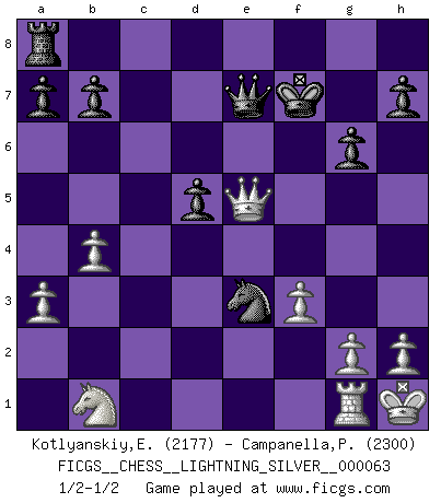 Last move : 1/2-1/2 2010 December 27 22:30:11 [Event "FICGS__CHESS__LIGHTNING_SILVER__000063"] [Site "FICGS"] [Date "2010.12.27"] [Round "1"] [White "Kotlyanskiy,Edward"] [Black "Campanella,Paul"] [Result "1/2-1/2"] [WhiteElo "2177"] [BlackElo "2300"] 1.e4 e5 2.Nf3 Nf6 3.Nxe5 d6 4.Nf3 Nxe4 5.d4 d5 6.Bd3 Bd6 7.O-O O-O 8.c4 c6 9.Qc2 Na6 10.a3 Bg4 11.Ne5 Bxe5 12.dxe5 Nac5 13.f3 Nxd3 14.Qxd3 Nc5 15.Qd4 Nb3 16.Qxg4 Nxa1 17.Bh6 g6 18.Bxf8 Qxf8 19.cxd5 Qc5+ 20.Kh1 Nc2 21.Qd7 Ne3 22.Rg1 cxd5 23.e6 fxe6 24.Qxe6+ Kf8 25.Qe5 Kf7 26.b4 Qe7 1/2-1/2 Petrov : Classical attack, Marshall variation Kingside Castling by player White (move 7) Kingside Castling by player Black (move 7) This chess game ended in a draw. Follow this game move after move (download)If you aren't afraid of Spassky, then I have removed the element of money. (Jim Slater) Wenn sie aufgeben, dann danke ich Ihnen für das Spiel (Eventualzug beim Fernschach). (Anonymous) El Ajedrez es tan interesante por sí solo, que no es necesario un interés monetario para persuadir a una persona a que lo practique; por lo tanto, nunca se juega por dinero. (Benjamin Franklin) Je fais ceci parce que dans cinquante coups j'obtiendrai cela; je m'appelle Mikhail Moisevitch Botvinnik. (Botvinnik) Experiences are the keys to life. (Daniel Parmet)