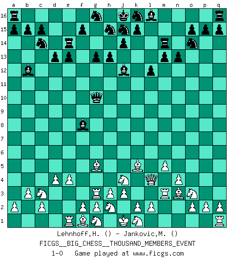 Last move : 1-0 2007 March 11 13:15:31 [Event "FICGS__BIG_CHESS__THOUSAND_MEMBERS_EVENT"] [Site "FICGS"] [Date "2006.12.05"] [Round "1"] [White "Lehnhoff,Heinz-Georg"] [Black "Jankovic,Mladen"] [Result "1-0"] [WhiteElo ""] [BlackElo ""] 1.e2-e4 g15-g13 2.d2-d4 m15-m13 3.j2-l3 h16-d12 4.b1-c3 n15-n13 5.h1-o7 p16-o14 6.c1-e3 h14-h13 7.a1-d1 d15-d13 8.m2-m4 e15-e13 9.n2-n4 f16-b12 10.o1-k5 b16-c14 11.p1-o3 c16-h11 12.m1-m3 h11-j12 13.o7-l4 l15-l13 14.d1-d3 l13-l12 15.l1-n3 o16-f8 16.m4-m5 d12-b10 17.b2-b3 m16-m14 18.l3-j4 e16-e14 19.e3-g5 b10-g10 20.d3-g3 1-0 This big chess game has been lost on time (started : 2006.12.05 12:43:9) Follow this game move after move (download)Of all my Russian books, the defense contains and diffuses the greatest 'warmth' which may seem odd seeing how supremely abstract Chess is supposed to be. (Vladimir Nabokov) Schon mancher Spieler hat aufgegeben, um zu vermeiden, daß er eine Figur verliert. (Savielly Grigorievitsch Tartakower) El jugador táctico sabe que hacer cuando hay algo que hacer; mientras que el estratega sabe que hacer cuando no hay nada que hacer. (Gerald Abrahams) Les erreurs sont comme les malheurs, elles n'arrivent jamais seules. (Siegbert Tarrasch) Internal peace cannot coexist with external war. (Don Groves)