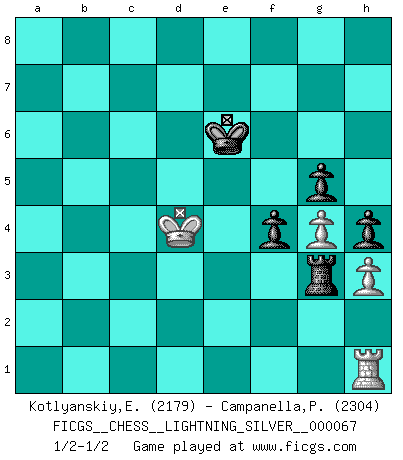 Last move : 1/2-1/2 2010 December 28 21:31:22 [Event "FICGS__CHESS__LIGHTNING_SILVER__000067"] [Site "FICGS"] [Date "2010.12.28"] [Round "1"] [White "Kotlyanskiy,Edward"] [Black "Campanella,Paul"] [Result "1/2-1/2"] [WhiteElo "2179"] [BlackElo "2304"] 1.d4 Nf6 2.Bf4 d5 3.Nf3 c5 4.e3 e6 5.Nc3 Be7 6.Nb5 Na6 7.h3 Bd7 8.a4 O-O 9.c3 Qb6 10.dxc5 Bxc5 11.Be2 Bxb5 12.axb5 Nc7 13.Qa4 a6 14.Bxc7 Qxc7 15.bxa6 bxa6 16.O-O Rfb8 17.Ra2 a5 18.Nd4 Bxd4 19.exd4 Ra7 20.Rb1 Ne4 21.Bd3 g6 22.Bxe4 dxe4 23.Qc2 f5 24.Qd2 Rb3 25.Rd1 Qb6 26.Qc1 Rb7 27.Rd2 Kg7 28.Re2 a4 29.Qf4 Qb5 30.Rc2 Qc4 31.Qe5+ Kh6 32.Qd6 Qd3 33.Qf4+ g5 34.Qc1 Kg6 35.Rd2 Qb5 36.Qf1 h5 37.Rc2 Qxf1+ 38.Kxf1 Ra7 39.f3 e3 40.g4 f4 41.Ke2 h4 42.Kd3 a3 43.bxa3 R7xa3 44.Rxa3 Rxa3 45.Ke4 e2 46.Rxe2 Rxc3 47.d5 exd5+ 48.Kxd5 Rxf3 49.Rh2 Rc3 50.Ke5 Re3+ 51.Kd4 Kf6 52.Kd5 Rd3+ 53.Ke4 Rg3 54.Kd4 Rb3 55.Rh1 Ra3 56.Kd5 Rg3 57.Kd4 Ke6 1/2-1/2 Comment by player 2 : Paul Campanella : Great game, Edward! This is exactly what happened in some of my other games... as good as rybka 4 may be IT DOESN'T SEEM TO REALIZE OBVIOUS DRAWS!!! Edward Kotlyanskiy lol... can't put your full faith and confidence in one silcon engine! Queen's pawn game Kingside Castling by player Black (move 8) Kingside Castling by player White (move 16) 10 pieces endgame at move 48 : White KRPPP , Black KRPPP WHITE : King + 1 Rook 3 Pawns BLACK : King + 1 Rook 3 Pawns 9 pieces endgame at move 48 : White KRPP , Black KRPPP WHITE : King + 1 Rook 2 Pawns BLACK : King + 1 Rook 3 Pawns This chess game ended in a draw. Follow this game move after move (download)You know you're going to lose. Even when I was ahead I knew I was going to lose. - On playing against Fischer. (Andrew Soltis) Ich moechte nie einem Club beitreten, der Leute wie mich als Mitglieder aufnimmt. (Woody Allen) Una clavada es mas poderosa que una espada. (Fred Reinfeld) Comme les marins qui ont mille raisons différentes d'aller en mer, les joueurs d'échecs en ont tout autant avant de s'installer devant une table et jouer... (Vincent Bertignac, philosophe) Good decisions come from experience, and experience comes from bad decisions. (Anonymous)