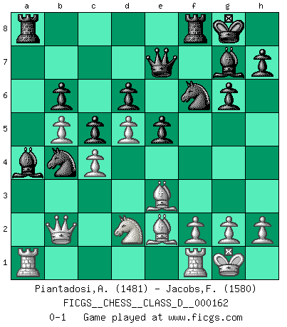 Last move : 0-1 2011 February 5 3:16:47 [Event "FICGS__CHESS__CLASS_D__000162"] [Site "FICGS"] [Date "2010.12.29"] [Round "1"] [White "Piantadosi,Angelo"] [Black "Jacobs,Francois"] [Result "0-1"] [WhiteElo "1481"] [BlackElo "1580"] 1.d4 Nf6 2.c4 g6 3.Nc3 Bg7 4.e4 d6 5.Nf3 O-O 6.Be2 e5 7.d5 Qe7 8.O-O a5 9.Be3 Na6 10.Rc1 Bd7 11.a3 Nc5 12.Qc2 Ne8 13.b4 axb4 14.axb4 Na6 15.Qb1 f5 16.exf5 Bxf5 17.Bd3 Bg4 18.Nd2 c5 19.b5 Nb4 20.Be2 Bf5 21.Qb3 b6 22.Ra1 Nf6 23.Na4 Bc2 24.Qb2 Bxa4 0-1 King's Indian : Petrosian system Kingside Castling by player Black (move 5) Kingside Castling by player White (move 8) Player Black won this chess game. Follow this game move after move (download)Fischer sacrificed virtually everything most of us weakies (to use his term) value, respect, and cherish, for the sake of an artful, often beautiful board game, for the ambivalent privilege of being its greatest master. (Paul Kollar) Es ist im Leben wie im Schachspiel. Wir entwerfen einen Plan, dieser bleibt jedoch bedingt durch das, was im Schachspiel dem Gegner, im Leben dem Schicksal zu tun belieben wird. (Arthur Schopenhauer) El Ajedrez es la vida. (Bobby Fischer) J'apprécie les joueurs d'est-indienne, c'est grâce à eux que je nourris ma famille depuis tant d'années. (Petrosian) If you don't practice you don't deserve to win. (Andre Agassi)
