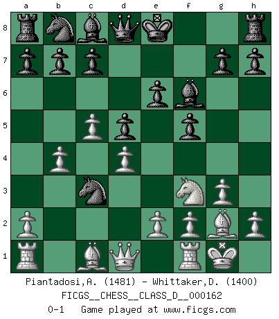 Last move : 0-1 2011 January 8 1:49:49 [Event "FICGS__CHESS__CLASS_D__000162"] [Site "FICGS"] [Date "2010.12.29"] [Round "1"] [White "Piantadosi,Angelo"] [Black "Whittaker,Deon"] [Result "0-1"] [WhiteElo "1481"] [BlackElo "1400"] 1.d4 f5 2.c4 e6 3.Nc3 Nf6 4.g3 Ne4 5.Bg2 d5 6.Nf3 Bd6 7.c5 Be7 8.b4 Bf6 9.O-O Nxc3 0-1 Dutch defense, Rubinstein variation Kingside Castling by player White (move 9) Player Black won this chess game. Follow this game move after move (download)What is the object of playing a gambit opening?... To acquire a reputation of being a dashing player at the cost of losing a game. (Siegbert Tarrasch) Irgendwie scheint mir sonntags früh um 9 Uhr der Killerinstinkt verloren gegangen zu sein. (Alexej Shirov) Cuando tengo las piezas blancas, yo gano porque soy blanco; Cuando tengo las piezas negras, yo gano porque soy Bogolyubov. (Bogolyubov) Les pièces de l'échiquier étaient impitoyables. Elles le retenaient, elles l'absorbaient. Il y avait de l'horreur en cela, mais aussi une harmonie unique. Car, qu'y a-t-il dans le monde, à part les échecs ? (V. Nabokov) Strategy without tactics is the slowest route to victory. Tactics without strategy is the noise before defeat. (Sun Tzu)