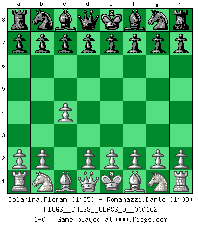 Last move : 1-0 2011 February 7 22:11:2 [Event "FICGS__CHESS__CLASS_D__000162"] [Site "FICGS"] [Date "2010.12.29"] [Round "1"] [White "Colarina,Floram"] [Black "Romanazzi,Dante"] [Result "1-0"] [WhiteElo "1455"] [BlackElo "1403"] 1.c4 1-0 This chess game has been lost on time (started : 2010.12.29 9:3:16) English Opening Player White won this chess game. Follow this game move after move (download)The most powerful weapon in Chess is to have the next move. (David Bronstein) Schach ist ein Teil der Kultur, und wenn es mit der Kultur abwärts geht, geht es auch mit dem Schach abwärts. (Mikhail Moiseyevich Botvinik) El Ajedrez es un expediente tonto que hace creer a la gente inactiva que hacen una cosa muy astuta cuando solamente estan perdiendo su tiempo. (George Bernard Shaw) Il s'avisa de me proposer d'apprendre les échecs qu'il jouait un peu... me voilà forcené des échecs. J'achète un échiquier, je m'enferme dans ma chambre, j'y passe des jours et des nuits à vouloir apprendre par cur toutes les parties. (Jean-Jacques Rousseau, Confessions) Now you put water in a cup, it becomes the cup; You put water into a bottle it becomes the bottle; You put it in a teapot it becomes the teapot. Water can flow or it can crash. Be water, my friend. (Bruce Lee)