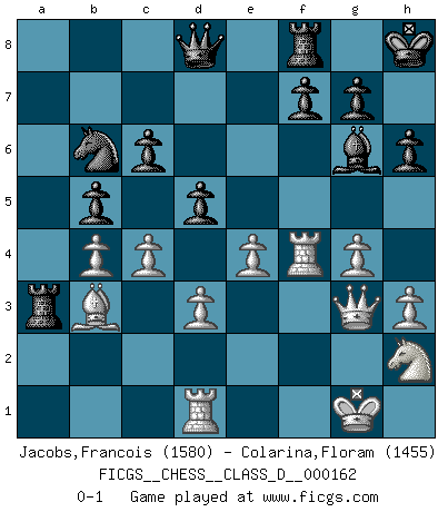 Last move : 0-1 2011 March 23 12:16:9 [Event "FICGS__CHESS__CLASS_D__000162"] [Site "FICGS"] [Date "2010.12.29"] [Round "1"] [White "Jacobs,Francois"] [Black "Colarina,Floram"] [Result "0-1"] [WhiteElo "1580"] [BlackElo "1455"] 1.e4 e5 2.Bc4 Nf6 3.d3 Be7 4.Nc3 O-O 5.Nf3 d6 6.O-O Bg4 7.Be3 Nc6 8.a3 a6 9.b4 b5 10.Bb3 Nb8 11.Nd5 Nxd5 12.Bxd5 c6 13.Bb3 Kh8 14.h3 Bh5 15.g4 Bg6 16.Qe2 Nd7 17.Nh2 Bg5 18.Qd2 Bxe3 19.Qxe3 h6 20.Qg3 a5 21.Rad1 axb4 22.axb4 Nb6 23.f4 exf4 24.Rxf4 d5 25.c4 Ra3 0-1 Bishop's Opening : Berlin defense Kingside Castling by player Black (move 4) Kingside Castling by player White (move 6) Player Black won this chess game. Follow this game move after move (download)Chess is a terrific way for kids to build self image and self esteem. (Saudin Robovic) Stelle das Brett so, daß die Sonne in die Augen deines Gegners scheint. (Ruy López) Yo siempre he tenido un ligero sentimiento de lástima por una persona que no tiene conocimiento del Ajedrez. (Siegbert Tarrasch) Aux échecs, les retours au sommet sont rares : les dommages psychologiques consécutifs à une défaite sont trop sévères. (Daily Telegraph) There are lots of people who mistake their imagination for their memory. (Josh Bilings)