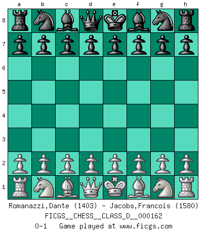 Last move : 0-1 2011 February 7 10:11:7 [Event "FICGS__CHESS__CLASS_D__000162"] [Site "FICGS"] [Date "2010.12.29"] [Round "1"] [White "Romanazzi,Dante"] [Black "Jacobs,Francois"] [Result "0-1"] [WhiteElo "1403"] [BlackElo "1580"] 0-1 This chess game has been lost on time (started : 2010.12.29 9:3:16) Player Black won this chess game. Follow this game move after move (download)Modern Chess is too much concerned with things like Pawn structure. Forget it, Checkmate ends the game. (Nigel Short) Wenn Schach ein enormer Dschungel ist, der seine Myriaden von Geheimnissen nicht preisgeben will, dann sind Computer die Kettensägen einer gewaltigen ökologisch unsensiblen Nutzholzfirma. (Nigel Short) Los Peones son nacidos libres, y aún así, se encuentran encadenados por todos lados. (Rick Kennedy) Le génie consiste à savoir transgresser les règles au moment opportun. (Teichmann) There is a very easy way to return from a casino with a small fortune : go there with a large one. (Jack Yelton)
