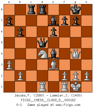Last move : 0-1 2011 January 27 11:39:40 [Event "FICGS__CHESS__CLASS_D__000162"] [Site "FICGS"] [Date "2010.12.29"] [Round "1"] [White "Jacobs,Francois"] [Black "Lommler,Jan Peter"] [Result "0-1"] [WhiteElo "1580"] [BlackElo "1400"] 1.e4 c5 2.c3 d5 3.exd5 Qxd5 4.d4 Nf6 5.Nf3 e6 6.Be3 cxd4 7.cxd4 Nc6 8.Nc3 Qd8 9.Bd3 Be7 10.a3 O-O 11.O-O b6 12.Qc2 Bb7 13.Ne4 Nxe4 14.Bxe4 Rc8 15.Bxh7+ Kh8 16.Be4 Nxd4 17.Qd1 Bxe4 18.Nxd4 Qd5 19.Qg4 Kg8 20.Rad1 Rfd8 0-1 Sicilian : Alapin's variation (2.c3) Kingside Castling by player Black (move 10) Kingside Castling by player White (move 11) Player Black won this chess game. Follow this game move after move (download)Chess is a matter of delicate judgment, knowing when to punch and how to duck. (Bobby Fischer) Mein erstes Ziel war nicht, die Partie zu gewinnen, sondern eine Figur zu opfern. -- der junge (Wilhelm Steinitz) El Ajedrez es el gimnasio de la mente. (Blaise Pascal) Je fais ceci parce que dans cinquante coups j'obtiendrai cela; je m'appelle Mikhail Moisevitch Botvinnik. (Botvinnik) Dave, my mind is going. I can feel it. (HAL 9000 in 2001, a space odyssey)