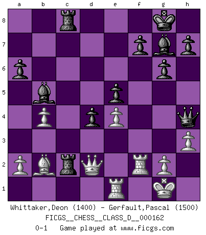 Last move : 0-1 2011 January 23 11:54:12 [Event "FICGS__CHESS__CLASS_D__000162"] [Site "FICGS"] [Date "2010.12.29"] [Round "1"] [White "Whittaker,Deon"] [Black "Gerfault,Pascal"] [Result "0-1"] [WhiteElo "1400"] [BlackElo "1500"] 1.e4 c5 2.Nf3 Nc6 3.Bb5 g6 4.O-O Bg7 5.Bxc6 bxc6 6.c4 d5 7.Qa4 Bd7 8.d4 cxd4 9.cxd5 cxd5 10.Qb3 dxe4 11.Ng5 e6 12.Nxe4 Bc6 13.Nbd2 Nf6 14.f3 O-O 15.Qd3 a6 16.b4 Bb5 17.Nc4 Nxe4 18.fxe4 Rc8 19.Rf2 Bxc4 20.Qd2 e5 21.Ba3 Bb5 22.Rc1 Qh4 23.Re1 Rc7 24.h3 Rfc8 25.Bb2 Rc2 0-1 Sicilian : Nimzovich-Rossolimo attack (with ...g6, without ...d6) Kingside Castling by player White (move 4) Kingside Castling by player Black (move 14) Player Black won this chess game. Follow this game move after move (download)It's always better to sacrifice your opponent's men. (Savielly Tartakover) Schach ist das schnellste Spiel der Welt, weil man in jeder Sekunde Tausende von Gedanken ordnen muß. (Albert Einstein) La caracteristica mas importante en la posición del Ajedrez es la actividad de las piezas. Esto es absolutamente fundamental en todas las fases del juego: Apertura, Juego Medio y especialmente Finales. La limitación primordial en la actividad de una pieza, es la estructuración de los Peones. (Michael Stean) C'est une question de caractère, Beaucoup de gens perdent leur motivation très vite. D'autres, ils sont rares, peuvent la conserver très longtemps. J'aime les échecs, encore aujourd'hui je suis heureux d'analyser des parties. J'aime toujours gagner, je déteste encore perdre. Bien jouer est important pour mon intégrité intellectuelle et morale. Et puis les échecs vivent en ce moment une période historique grâce à Internet. Ils se développent dans les systèmes éducatifs à travers le monde. Ils sortent de leur ghetto, et c'est mon rôle de mener à bien cette révolution. (Gary Kasparov) True nature is revealed in times of difficulty. (Chinese proverb)