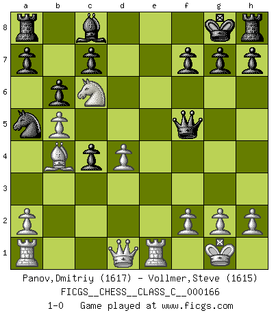 Last move : 1-0 2011 January 3 22:16:15 [Event "FICGS__CHESS__CLASS_C__000166"] [Site "FICGS"] [Date "2010.12.29"] [Round "1"] [White "Panov,Dmitriy"] [Black "Vollmer,Steve"] [Result "1-0"] [WhiteElo "1617"] [BlackElo "1615"] 1.e4 e5 2.Nf3 Nc6 3.Bc4 Bc5 4.c3 Nf6 5.d4 exd4 6.cxd4 Bb4+ 7.Nc3 Nxe4 8.O-O Nxc3 9.bxc3 d5 10.cxb4 dxc4 11.Re1+ Kf8 12.b5 Na5 13.Ba3+ Kg8 14.Be7 Qd7 15.Bb4 b6 16.Ne5 Qf5 17.Nc6 1-0 Giuoco Piano : Greco's attack Kingside Castling by player White (move 8) Player White won this chess game. Follow this game move after move (download)You are for me the Queen on d8 and I am the Pawn on d7 !! (Eduard Gufeld) Es ist besser die Steine des Gegners zu opfern. (Savielly Grigorievitsch Tartakower) Las combinaciones han sido siempre el aspecto más intrigante del Ajedrez. Los Maestros las buscan, el público las aplauden, los críticos las alaban. La razón se debe a que las combinaciones hacen posible que el Ajedrez sea más que un ejercicio matemático con una carencia de vida. Ellas son la poesía del juego, son del Ajedrez lo que la melodía es de la música. Ellas representan el triunfo de la mente sobre la materia. (Reuben Fine) Shah mat. Le roi est mort. Cri de fierté d'un joueur venant de terrasser son adversaire, courtoisement, sans effusion de sang. Men should grow up. - Yeah. And dogs should stop licking themselves. It's not gonna happen. (Gregory House to Dr. Cameron, House M.D.)