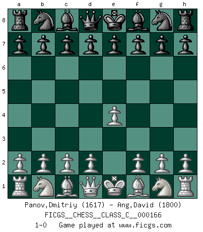Last move : 1-0 2011 January 3 10:52:21 [Event "FICGS__CHESS__CLASS_C__000166"] [Site "FICGS"] [Date "2010.12.29"] [Round "1"] [White "Panov,Dmitriy"] [Black "Ang,David"] [Result "1-0"] [WhiteElo "1617"] [BlackElo "1800"] 1.e4 1-0 King's pawn Opening Player White won this chess game. Follow this game move after move (download)All Chess players should have a hobby. (Savielly Tartakower) Wenn Du einsam bist, wenn Du Dich in der Welt wie ein Fremder fühlst, spiele Schach. Das wird Deinen Geist erheben und Dein Ratgeber im Kampf sein. (Aristoteles) ¿Porque tengo que perder ante este idiota?. (Aron Nimzovich) Votre seul travail dans les ouvertures est d'obtenir un milieu de partie jouable. (Lajos Portish) Creativity is inventing, experimenting, growing, taking risks, breaking rules, making mistakes, and having fun. (Mary Lou Cook)
