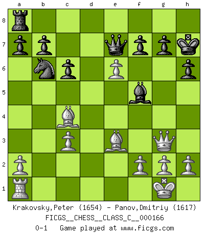 Last move : 0-1 2011 March 31 2:6:49 [Event "FICGS__CHESS__CLASS_C__000166"] [Site "FICGS"] [Date "2010.12.29"] [Round "1"] [White "Krakovsky,Peter"] [Black "Panov,Dmitriy"] [Result "0-1"] [WhiteElo "1654"] [BlackElo "1617"] 1.e4 e5 2.Nf3 Nf6 3.Nxe5 d6 4.Nf3 Nxe4 5.d4 d5 6.Bd3 Bd6 7.O-O O-O 8.c4 c6 9.Re1 Re8 10.Nc3 Nxc3 11.bxc3 Rxe1+ 12.Qxe1 h6 13.Ne5 Qe7 14.Qe3 Bxe5 15.dxe5 dxc4 16.Bxc4 Bf5 17.Qg3 Kh7 18.Be3 Nd7 19.e6 Nb6 0-1 This chess game has been lost on time (started : 2010.12.29 10:40:47) Petrov : Classical attack, Marshall variation Kingside Castling by player White (move 7) Kingside Castling by player Black (move 7) Player Black won this chess game. Follow this game move after move (download)Chess is the gymnasium of the mind. (Blaise Pascal) Gott hat gewollt, dass ich Champion werde. (Surab Azmajparaschvili) Aquellos que dicen entender al Ajedrez, no entienden nada. (Robert Hubner) La solitude du joueur d'Echecs à l'approche du mat est semblable à celle du condamné. (Francis Szpiner) A government big enough to give you everything you want is strong enough to take everything you have. (Thomas Jefferson)