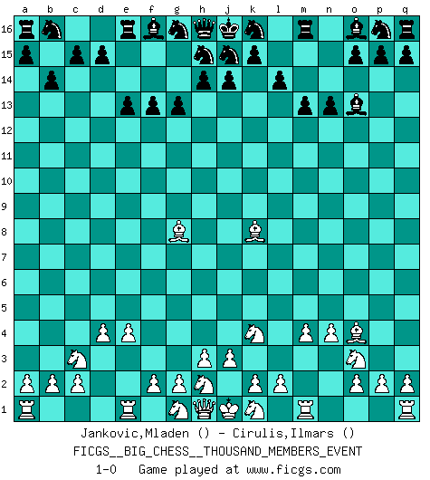 Last move : 1-0 2007 March 24 14:0:50 [Event "FICGS__BIG_CHESS__THOUSAND_MEMBERS_EVENT"] [Site "FICGS"] [Date "2006.12.05"] [Round "1"] [White "Jankovic,Mladen"] [Black "Cirulis,Ilmars"] [Result "1-0"] [WhiteElo ""] [BlackElo ""] 1.m2-m4 g15-g13 2.e2-e4 n15-n13 3.d2-d4 m15-m13 4.n2-n4 f15-f13 5.p1-o3 e15-e14 6.o1-g8 b15-b14 7.l1-o4 c16-a14 8.f1-c4 l15-l14 9.c1-k8 a14-g8 10.c4-g8 e14-e13 11.b1-c3 l16-o13 12.j2-k4 1-0 Follow this game move after move (download)The combination player thinks forward; he starts from the given position, and tries the forceful moves in his mind. (Emanuel Lasker) Konzentriere dich auf materielle Gewinne. Nimm, was dir dein Gegner gibt, ausser es gibt einen guten Grund der dagegenspricht. (Robert James Fischer) Combinaciones deslumbrantes son para la mayoría, mover madera es para los pocos. (Georg Kieninger) La guerre est enfant de la passion, la passion est enfant du narcissisme et le narcissisme est l'enfant. (...) Une autre partie ? (Thibault de Vassal) I've lost money so fast in these clubs it's left me reeling. I've read every poker book ever written, but the only way to get better at the game is to go out and play with people who are really good. The problem is, you stand to lose a lot of money doing it. (Matt Damon)
