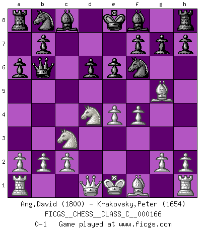 Last move : 0-1 2011 January 3 10:53:9 [Event "FICGS__CHESS__CLASS_C__000166"] [Site "FICGS"] [Date "2010.12.29"] [Round "1"] [White "Ang,David"] [Black "Krakovsky,Peter"] [Result "0-1"] [WhiteElo "1800"] [BlackElo "1654"] 1.e4 c5 2.Nf3 d6 3.d4 cxd4 4.Nxd4 Nf6 5.Nc3 a6 6.Bg5 e6 7.f4 Qb6 0-1 Sicilian : Najdorf, 7...Qb6 Player Black won this chess game. Follow this game move after move (download)Robert Fischer is a law unto himself. (Larry Evans) Wenn Schach ein enormer Dschungel ist, der seine Myriaden von Geheimnissen nicht preisgeben will, dann sind Computer die Kettensägen einer gewaltigen ökologisch unsensiblen Nutzholzfirma. (Nigel Short) Alekhine es un poeta que crea un trabajo de arte de algo que raramente inspiraría a otra persona a mandar una tarjeta postal. (Max Euwe) Mon pion favori sur ma case favorite ! Bronstein en parlant d'un coup de pion en h5 quand il avait les Noirs. The Internet is so big, so powerful and pointless that for some people it is a complete substitute for life. (Andrew Brown)