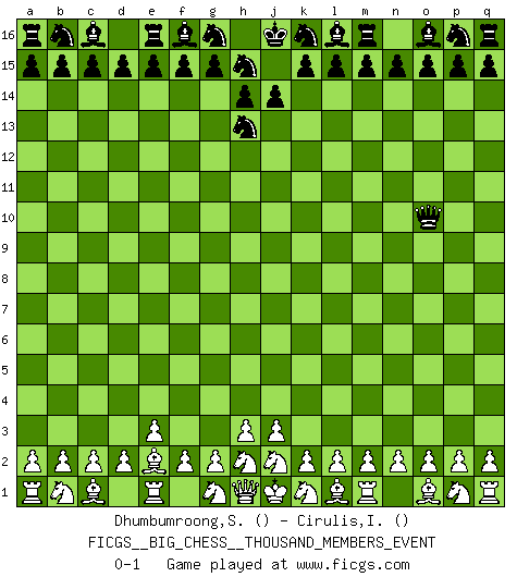 Last move : 0-1 2007 February 12 4:2:25 [Event "FICGS__BIG_CHESS__THOUSAND_MEMBERS_EVENT"] [Site "FICGS"] [Date "2006.12.05"] [Round "1"] [White "Dhumbumroong,Smith"] [Black "Cirulis,Ilmars"] [Result "0-1"] [WhiteElo ""] [BlackElo ""] 1.e2-e3 j15-h13 2.f1-e2 h16-o10 0-1 This big chess game has been lost on time (started : 2006.12.05 12:43:9) Follow this game move after move (download)In Chess, at least, the brave inherit the earth. (Edmar Mednis) Stil? Ich habe keinen Stil! (Anatoly Karpov) El Ajedrez tiene tanto misterio como las mujeres. (Purdy) Seul un grand joueur sait à quel point il joue faiblement. (Xavier Tartacover) Control your own destiny or someone else will. (Jack Welch)