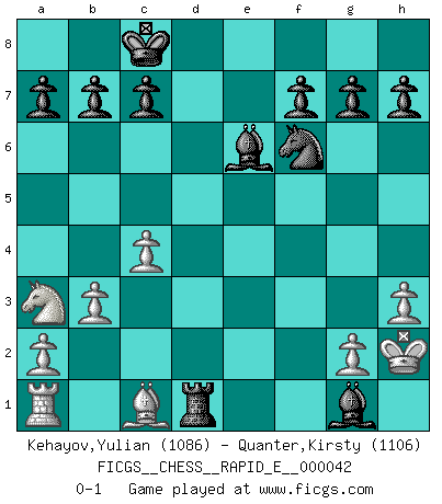 Last move : 0-1 2011 January 7 12:4:3 [Event "FICGS__CHESS__RAPID_E__000042"] [Site "FICGS"] [Date "2010.12.30"] [Round "1"] [White "Kehayov,Yulian"] [Black "Quanter,Kirsty"] [Result "0-1"] [WhiteElo "1086"] [BlackElo "1106"] 1.e4 e5 2.Nf3 d5 3.exd5 Qxd5 4.d4 exd4 5.Qxd4 Qe6+ 6.Qe3 Bc5 7.Qxe6+ Bxe6 8.Bd3 Nf6 9.O-O Nc6 10.c4 Nb4 11.Rd1 O-O-O 12.Ne1 Nxd3 13.Rxd3 Rxd3 14.Nxd3 Rd8 15.h3 Rxd3 16.Na3 Rd1+ 17.Kh2 Bxf2 18.b3 Bg1+ 0-1 QP counter-gambit (elephant gambit) Kingside Castling by player White (move 9) Queenside Castling by player Black (move 11) Player Black won this chess game. Follow this game move after move (download)Adequate compensation for a sacrifice is having a sound combination leading to a winning position; adequate compensation for a blunder is having your opponent snatch defeat from the jaws of victory. (Bruce A. Moon) Über die Verhaftung Bobby Fischers: Warum es die Bush-Administration für nötig befindet einen 61 Jahre alten Mann zu hetzten, der für niemanden ausser sich selbste eine Gefahr darstellt ist ein Rätsel. (Nigel Short) En la vida, como en el Ajedrez, los Peones propios obstruyen nuestro camino. La gran fortuna de un hombre, su comodidad, placer, hijos, libros, que deberían ayudarle a ganar, con mucha frecuencia lo ponen en Jaque Mate. (Charles Buxton) Dieu déplace le joueur, et celui-ci la pièce. Quel Dieu derrière Dieu commence donc la trame ? Arturo Perez-Reverte (prix de littérature policière 1993). Only sick music makes money today. (Friedrich Nietzsche)