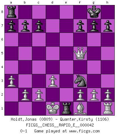 Last move : 0-1 2011 February 15 8:29:12 [Event "FICGS__CHESS__RAPID_E__000042"] [Site "FICGS"] [Date "2010.12.30"] [Round "1"] [White "Holdt,Jonas"] [Black "Quanter,Kirsty"] [Result "0-1"] [WhiteElo "0809"] [BlackElo "1106"] 1.e4 e5 2.Nf3 d5 3.exd5 Qxd5 4.Nc3 Qe6 5.Qe2 Nc6 6.d3 Nf6 7.Bg5 Bb4 8.Bd2 O-O 9.a3 Bxc3 10.Bxc3 Re8 11.O-O-O Qa2 12.Nxe5 Nxe5 13.Bxe5 Bf5 14.Re1 Nd7 15.Qf3 Nxe5 16.Qxf5 Qa1+ 17.Kd2 Qxe1+ 18.Kxe1 Nf3+ 19.Kd1 Re1+ 0-1 QP counter-gambit (elephant gambit) Kingside Castling by player Black (move 8) Queenside Castling by player White (move 11) Player Black won this chess game. Follow this game move after move (download)You know, comrade Pachman, I don't enjoy being a Minister, I would rather play Chess like you. (Che Guevara) Als er Schachweltmeister wurde ließ er praktisch alle stärksten Sovietspieler für sich arbeiten. Wenn ein auch nur mittelmässiger Meister ein Spezialist für eine bestimmte Eröffnung war, wurde er von Karpov gerufen. Das wurde alles geheim gehalten. (Mikhail Moiseyevich Botvinik) El Ajedrez no es una pizca de inferior al violín, y tenemos un gran número de violinistas profesionales. (Mikhail Botvinnik) Des idées, des idées, j'en ai cent, j'en ai mille. Des bonnes, des mauvaises, applicables, irréalisables... Il suffit de faire le tri ! (Roos) Happy endings are just stories that haven't finished yet. (Jane Smith in Mr & Mrs Smith)