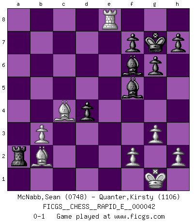 Last move : 0-1 2011 March 1 11:18:16 [Event "FICGS__CHESS__RAPID_E__000042"] [Site "FICGS"] [Date "2010.12.30"] [Round "1"] [White "McNabb,Sean"] [Black "Quanter,Kirsty"] [Result "0-1"] [WhiteElo "0748"] [BlackElo "1106"] 1.e4 c5 2.Nf3 d5 3.exd5 Qxd5 4.Nc3 Qe6+ 5.Be2 Nc6 6.O-O a6 7.Bd3 Nf6 8.Re1 Qd6 9.b3 e6 10.Bb2 Be7 11.Ne4 Nxe4 12.Bxe4 O-O 13.d4 Rd8 14.c3 cxd4 15.cxd4 Bf6 16.Qd2 Nxd4 17.Nxd4 e5 18.Qa5 exd4 19.Rac1 g6 20.g3 Re8 21.Bg2 Rxe1+ 22.Rxe1 Bf5 23.Bxb7 Rb8 24.Qxa6 Qxa6 25.Bxa6 Ra8 26.Bc4 Rxa2 27.Re8+ Kg7 0-1 This chess game has been lost on time (started : 2010.12.30 1:53:39) Sicilian defense Kingside Castling by player White (move 6) Kingside Castling by player Black (move 12) Player Black won this chess game. Follow this game move after move (download)Chess, like love, is infectious at any age. (Flohr) Frage: Gibt es etwas was Sie mehr lieben als Autobahnen ohne Tempobegrenzungen? - Antwort: Deutsche Frauen ohne Tempobegrenzungen. (Loek van Wely) Las leyes del Ajedrez no permiten una libre elección: tienes que mover quieras o no. (Emanuel Lasker) C'est la seule position que je connaisse où les deux camps sont mals. Propos prêtés à V. Anand. Pushing plastic is for the many, pushing virtual pieces is for the fewer, pushing wood is for the very few. (Normajean Yates)