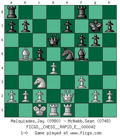 Last move : 1-0 2011 February 20 10:48:56 [Event "FICGS__CHESS__RAPID_E__000042"] [Site "FICGS"] [Date "2010.12.30"] [Round "1"] [White "Melquiades,Jay"] [Black "McNabb,Sean"] [Result "1-0"] [WhiteElo "0980"] [BlackElo "0748"] 1.e4 c5 2.Nf3 Nc6 3.Bb5 d6 4.Nc3 Nf6 5.d3 g6 6.Bg5 Bg7 7.e5 dxe5 8.Nxe5 O-O 9.Bxf6 Nxe5 10.Bxg7 Kxg7 11.Qe2 Qd6 12.O-O-O Bg4 13.f3 Bf5 14.Rhe1 f6 15.d4 1-0 This chess game has been lost on time (started : 2010.12.30 1:53:39) Sicilian : Nimzovich-Rossolimo attack (without ...d6) Kingside Castling by player Black (move 8) Queenside Castling by player White (move 12) Player White won this chess game. Follow this game move after move (download)It's always better to sacrifice your opponent's men. (Savielly Tartakover) Der Freibauer hat für mich eine Seele, genau wie der Mensch, Wünsche, die unerkannt in ihm schlummern, und Befürchtungen, von deren Existenz er selbst kaum ahnt. (Aaron Nimzowitsch) Es el objetivo de la escuela moderna no tratar cada posición de acuerdo a una regla general, sino de acuerdo al principio inherente en la posición. (Richard Reti) Mais l'homme est une créature légère et illogique : semblable au joueur d'échecs, il n'aime que le processus du but à atteindre, non le but lui-même. (Dostoïevsky) I just play for fun. (Anna Kournikova)