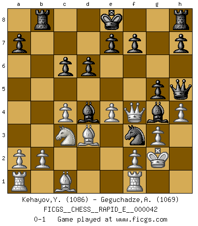Last move : 0-1 2011 January 18 12:11:41 [Event "FICGS__CHESS__RAPID_E__000042"] [Site "FICGS"] [Date "2010.12.30"] [Round "1"] [White "Kehayov,Yulian"] [Black "Geguchadze,Alexander"] [Result "0-1"] [WhiteElo "1086"] [BlackElo "1069"] 1.e4 c5 2.c4 Nc6 3.Nf3 d6 4.d4 cxd4 5.Nxd4 Nf6 6.Nc3 g6 7.Nxc6 bxc6 8.Bd3 Rb8 9.O-O Bg7 10.Qe2 Ng4 11.Qd2 Qa5 12.Qe1 Qe5 13.g3 Qh5 14.h4 Ne5 15.Qe2 Bg4 16.Qe3 Nf3+ 17.Kg2 Bd4 18.Qf4 g5 0-1 Sicilian defense Kingside Castling by player White (move 9) Player Black won this chess game. Follow this game move after move (download)You are for me the Queen on d8 and I am the Pawn on d7 !! (Eduard Gufeld) Matt entspricht nicht immer den Tatsachen. (Savielly Grigorievitsch Tartakower) Una victoria por una combinación errónea, aunque sea espectacular, me llena de horror artístico. (Wilhelm Steinitz) Si rien de grave n'est détecté lors de l'analyse d'une position, on joue alors le coup. Seconde règle de Blumenfeld. Unless I accept my faults I will most certainly doubt my virtues. (Hugh Prather)