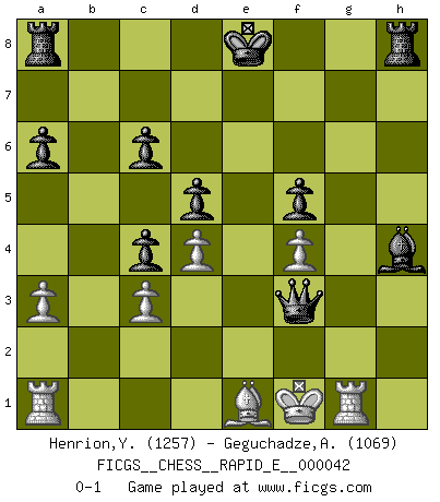 Last move : 0-1 2011 February 10 8:33:48 [Event "FICGS__CHESS__RAPID_E__000042"] [Site "FICGS"] [Date "2010.12.30"] [Round "1"] [White "Henrion,Yann"] [Black "Geguchadze,Alexander"] [Result "0-1"] [WhiteElo "1257"] [BlackElo "1069"] 1.c4 c5 2.Nc3 Nc6 3.e3 e6 4.d4 d5 5.cxd5 exd5 6.Bb5 Nf6 7.Nf3 a6 8.Bxc6+ bxc6 9.Ne5 Qc7 10.O-O Bd6 11.Nf3 Bg4 12.h3 Bh5 13.g4 Bg6 14.Na4 c4 15.Nc3 Ne4 16.Nh4 Nxc3 17.bxc3 Be4 18.f3 Bd3 19.Rf2 Bg3 20.Rg2 Bxh4 21.f4 g5 22.a3 Be4 23.Rb2 h5 24.Bd2 hxg4 25.Qxg4 f5 26.Qe2 gxf4 27.exf4 Qg7+ 28.Kf1 Qg3 29.Be1 Qxh3+ 30.Qg2 Bxg2+ 31.Rxg2 Qh1+ 32.Rg1 Qf3+ 0-1 English : Symmetrical variation Kingside Castling by player White (move 10) Player Black won this chess game. Follow this game move after move (download)Though most people love to look at the games of the great attacking masters, some of the most successful players in history have been the quiet positional players. They slowly grind you down by taking away your space, tying up your pieces, and leaving you with virtually nothing to do ! (Yasser Seirawan) Nicht daß Diemer aus Opportunismus Mitglied der NSDAP geworden wäre. Er war ein Fanatiker, in allem, was er tat. (Hans Ree) El Ajedrez es parte de una cultura y si una cultura esta en decadencia, entonces también el Ajedrez declinará. (Mikhail Botvinnik) Aux échecs, l'amour-propre est satisfait quand on remporte la victoire, mais il n'y a pas de honte à être battu. (Benjamin Franklin) God is an atheist. (Unknown)