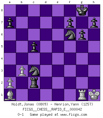Last move : 0-1 2011 March 20 22:15:49 [Event "FICGS__CHESS__RAPID_E__000042"] [Site "FICGS"] [Date "2010.12.30"] [Round "1"] [White "Holdt,Jonas"] [Black "Henrion,Yann"] [Result "0-1"] [WhiteElo "0809"] [BlackElo "1257"] 1.b3 e5 2.Bb2 d6 3.e3 Nf6 4.Bc4 d5 5.Bb5+ c6 6.Be2 Bd6 7.Nf3 O-O 8.Nxe5 Re8 9.Nd3 Be6 10.O-O g6 11.Nc3 Qc7 12.Na4 Bxh2+ 13.Kh1 Nfd7 14.g3 Bxg3 15.fxg3 Qxg3 16.Nf4 c5 17.Nxe6 Rxe6 18.Rf3 Qg5 19.Rh3 Re4 20.Bf3 Rh4 21.Qf1 Rxh3+ 22.Qxh3 Ne5 23.Bxd5 Nbd7 24.Rg1 Qe7 25.Bxb7 Rb8 26.Bd5 Qd6 27.Nc3 Nf6 28.Qg2 Rd8 29.Be4 Qxd2 30.Qxd2 Rxd2 31.Bd3 Nxd3 32.Ba1 Rxc2 33.e4 Nf2+ 34.Kg2 N2xe4 35.Kh1 Nxc3 0-1 Nimzovich-Larsen attack : Modern variation Kingside Castling by player Black (move 7) Kingside Castling by player White (move 10) Player Black won this chess game. Follow this game move after move (download)I prefer to lose a really good game than to win a bad one. (David Levy) Alle Schachspieler sollten auch ein Hobby haben. (Savielly Grigorievitsch Tartakower) El Ajedrez no es una pizca de inferior al violín, y tenemos un gran número de violinistas profesionales. (Mikhail Botvinnik) Nous vivons dans un monde échiquéen : chaque jour qui passe est un défi à relever. (Philosophe Sasha) To send light into the darkness of men's hearts - such is the duty of the artist. (Schumann)