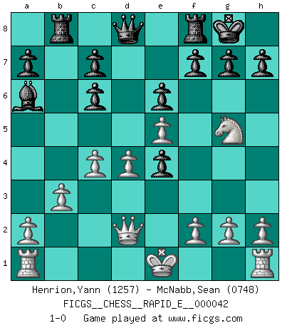 Last move : 1-0 2011 February 17 22:40:44 [Event "FICGS__CHESS__RAPID_E__000042"] [Site "FICGS"] [Date "2010.12.30"] [Round "1"] [White "Henrion,Yann"] [Black "McNabb,Sean"] [Result "1-0"] [WhiteElo "1257"] [BlackElo "0748"] 1.d4 Nf6 2.Nc3 e6 3.e4 Bb4 4.Bd2 Nc6 5.Nf3 d5 6.e5 Ne4 7.Bb5 O-O 8.Nxe4 dxe4 9.Bxc6 Bxd2+ 10.Qxd2 bxc6 11.Ng5 Rb8 12.b3 Ba6 13.c4 1-0 This chess game has been lost on time (started : 2010.12.30 1:53:39) Queen's pawn game Kingside Castling by player Black (move 7) Player White won this chess game. Follow this game move after move (download)Chess is imagination. (David Bronstein) Wenn es im Universum noch irgendwo intelligente Lebewesen gibt, dann kennen sie Go. (Emanuel Lasker) Jugadores de primera clase pierden en contra de jugadores de segunda clase porque los jugadores de segunda clase a veces juegan una partida de primer clase. (Siegbert Tarrasch) On est toujours la mazette de quelqu'un d'autre. (Anonyme) Luck has a peculiar habit of favoring those who don't depend on it. (Author unknown)