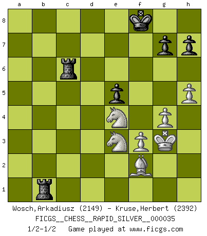 Last move : 1/2-1/2 2011 April 16 18:55:34 [Event "FICGS__CHESS__RAPID_SILVER__000035"] [Site "FICGS"] [Date "2010.12.30"] [Round "1"] [White "Wosch,Arkadiusz"] [Black "Kruse,Herbert"] [Result "1/2-1/2"] [WhiteElo "2149"] [BlackElo "2392"] 1.e4 c5 2.Nf3 d6 3.d4 cxd4 4.Nxd4 Nf6 5.Nc3 a6 6.Be2 e5 7.Nb3 Be7 8.O-O O-O 9.Be3 Be6 10.Qd2 Nbd7 11.a4 Qc7 12.a5 Rac8 13.Rfd1 Rfe8 14.Qe1 Qc6 15.Bf3 Ng4 16.Bd2 Bh4 17.g3 Bd8 18.Kg2 b5 19.axb6 Bxb6 20.Bxg4 Bxg4 21.f3 Be6 22.Be3 f5 23.exf5 Bxf5 24.Rxa6 Qc4 25.Rxb6 Nxb6 26.Bxb6 Bxc2 27.Nd2 Qb4 28.Bf2 Bxd1 29.Qxd1 Qxb2 30.Nde4 Kh8 31.Na4 Qa2 32.Nac3 Qc4 33.Nd5 Qc6 34.Qd2 Qc1 35.Qd3 Qc2 36.Qa3 Qc6 37.Qxd6 Red8 38.Qxc6 Rxc6 39.Ne3 Rb8 40.h4 Kg8 41.g4 Kf8 42.Kg3 Rb2 43.h5 Rb1 1/2-1/2 Sicilian : Najdorf, Opovcensky variation Kingside Castling by player White (move 8) Kingside Castling by player Black (move 8) This chess game ended in a draw. Follow this game move after move (download)Everything is in a state of flux, and this includes the world of Chess. (Mikhail Botvinnik) Es ist peinlich, dass ich nie Weltmeister wurde. Es wäre leicht, Leonid Breschnjew als Ursache vorzuschieben, dessen Apparat den Vorzeigekommunisten Anatoli Karpow in allem unterstützte. Aber Garri Kasparow zum Beispiel, der ebenfalls von den Sowjets unerwünscht war, hat trotz der Widerstände den WM-Titel erobert. (Viktor Kortschnoi) La última cosa en que Fischer estaba interesado era en tonterías, siempre y cuando el Ajedrez estuviera involucrado. (Elie Agur) Seul un grand joueur sait à quel point il joue faiblement. (Xavier Tartacover) A bird doesn't sing because it has an answer, it sings because it has a song. (Maya Angelou)