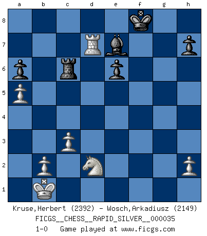 Last move : 1-0 2011 April 16 18:54:15 [Event "FICGS__CHESS__RAPID_SILVER__000035"] [Site "FICGS"] [Date "2010.12.30"] [Round "2"] [White "Kruse,Herbert"] [Black "Wosch,Arkadiusz"] [Result "1-0"] [WhiteElo "2392"] [BlackElo "2149"] 1.e4 c5 2.Nf3 Nc6 3.d4 cxd4 4.Nxd4 Nf6 5.Nc3 d6 6.Bg5 e6 7.Qd2 a6 8.Nxc6 bxc6 9.O-O-O Be7 10.Bxf6 gxf6 11.Bc4 Rb8 12.Rhe1 Qb6 13.Bb3 Rg8 14.f4 c5 15.Qe2 Kf8 16.a4 c4 17.Qxc4 Rxg2 18.Re2 Rg1 19.Qd3 Qc5 20.Kb1 Rxd1+ 21.Nxd1 f5 22.exf5 Qxf5 23.Qc3 Qf6 24.Qc7 Qd4 25.Ne3 Bf6 26.Nc4 Ra8 27.Qc6 Rb8 28.f5 Qc5 29.Qxd6+ Qxd6 30.Nxd6 Bd7 31.fxe6 fxe6 32.Ne4 Be7 33.a5 Kg7 34.Rg2+ Kf8 35.Bc4 Rc8 36.Rf2+ Kg7 37.Rd2 Rxc4 38.Rxd7 Kf8 39.Nd2 Rc6 40.c3 1-0 Sicilian defense Queenside Castling by player White (move 9) Player White won this chess game. Follow this game move after move (download)I played Chess with him and would have beaten him sometimes only he always took back his last move, and ran the game out differently. (Mark Twain) Schach verlangt totale Konzentration. (Robert James Fischer) Ayuda a tus piezas para que ellas te puedan ayudar. (Paul Morphy) Votre seul travail dans les ouvertures est d'obtenir un milieu de partie jouable. (Lajos Portish) All maxims have their antagonist maxims; proverbs should be sold in pairs, a single one being but a half truth. (William Mathews)