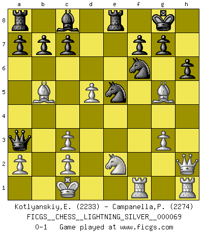 Last move : 0-1 2010 December 30 3:18:0 [Event "FICGS__CHESS__LIGHTNING_SILVER__000069"] [Site "FICGS"] [Date "2010.12.30"] [Round "1"] [White "Kotlyanskiy,Edward"] [Black "Campanella,Paul"] [Result "0-1"] [WhiteElo "2233"] [BlackElo "2274"] 1.e4 e5 2.f4 exf4 3.g3 fxg3 4.hxg3 d5 5.Qe2 Nf6 6.exd5 Be7 7.Nc3 O-O 8.Qh2 Re8 9.Bc4 Nbd7 10.d4 Bc5 11.Nge2 Bxd4 12.Bg5 Bxc3+ 13.bxc3 h6 14.O-O-O Qe7 15.Rdf1 Ne5 16.Bb5 Qa3+ 0-1 King's gambit accepted Kingside Castling by player Black (move 7) Queenside Castling by player White (move 14) Player Black won this chess game. Follow this game move after move (download)It is not enough to be a good player... you must also play well. (Siegbert Tarrasch) Es macht mich traurig, wenn ich sehe, dass Golfprofis mehr verdienen als Schachsportler. Obwohl ich davon überzeugt bin, dass wir Schachspieler viel härter trainieren müssen als die Golfer. (Alexandra Kosteniuk) El Ajedrez es tan inspirador que yo no creo que un buen jugador sea capaz de tener un pensamiento malo durante una partida. (Wilhelm Steinitz) Les échecs c'est le défi de l'alpiniste, toujours plus haut, prêt à tout pour monter à l'assaut du Roi ennemi. Les échecs, c'est de la musique en mouvement, un ballet majestueux pour les yeux. C'est de la poésie composée par les fantômes du passé qui au même titre que Rimbaud ou Verlaine méritent notre admiration. Les échecs, c'est de la peinture ou le moindre mouvement modifie le tableau pour en faire un Picasso ou un Van Gogh. Les échecs, c'est tout et rien, c'est la vie et la mort. Jjulie33 sur le forum de France-Echecs. Computers have lots of memory but no imagination. (Anonymous)