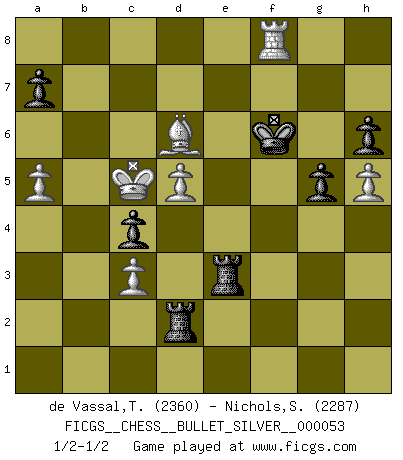 Last move : 1/2-1/2 2010 December 30 22:43:37 [Event "FICGS__CHESS__BULLET_SILVER__000053"] [Site "FICGS"] [Date "2010.12.30"] [Round "1"] [White "de Vassal,Thibault"] [Black "Nichols,Scott"] [Result "1/2-1/2"] [WhiteElo "2360"] [BlackElo "2287"] 1.d4 Nf6 2.c4 e6 3.Nf3 d5 4.Nc3 Bb4 5.Bg5 Nbd7 6.cxd5 exd5 7.e3 c5 8.Bd3 Qa5 9.Qc2 c4 10.Bf5 O-O 11.O-O Re8 12.Nd2 g6 13.Bh3 Kg7 14.Rfe1 Ne4 15.Ndxe4 dxe4 16.Bxd7 Bxd7 17.Bf4 Rac8 18.Reb1 Bc6 19.a3 Bxc3 20.Qxc3 Qxc3 21.bxc3 f6 22.a4 Kf7 23.a5 Ke6 24.h4 h6 25.Rb4 g5 26.Bg3 Kd5 27.Kf1 Rg8 28.h5 Rcf8 29.Ke2 f5 30.Be5 f4 31.Kd2 Rf5 32.Rab1 Rgf8 33.Rxb7 Bxb7 34.Rxb7 R8f7 35.Rb5+ Ke6 36.f3 exf3 37.gxf3 fxe3+ 38.Kxe3 Rxf3+ 39.Ke4 Kd7 40.d5 Rf2 41.Rb7+ Kd8 42.Rb8+ Kd7 43.Kd4 Re7 44.Rb7+ Ke8 45.Rb8+ Kf7 46.Bd6 Rd2+ 47.Kc5 Re3 48.Rf8+ Kg7 49.Ra8 Kf6 50.Rf8+ Kg7 51.Rd8 Kf6 52.Rf8+ Kg7 53.Rb8 Kf6 54.Rf8+ 1/2-1/2 Queen's pawn game Kingside Castling by player Black (move 10) Kingside Castling by player White (move 11) This chess game ended in a draw. Follow this game move after move (download)Examine moves that smite! A good eye for smites is far more important than a knowledge of strategical principles. (Purdy) Privat ist Kortschnoi kein schlechter Mensch, sehr sympathisch. Aber während des Spiels ist er grausam. Er will dich töten. (Miguel Najdorf) Una compensación adecuada por un sacrificio es tener una combinación sólida que conduce a una posición ganadora; una compensación adecuada por una metida de pata es dejar a tu oponente arrebatar una derrota de las fauces de la victoria. (Bruce A. Moon) Les échecs, c'est l'art d'analyser. (Mikhail Botvinnik) Life is like a play: it's not the length but the excellence of the acting that matters. (Seneca)