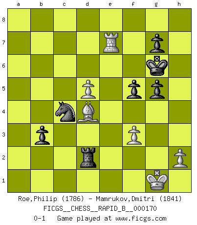 Last move : 0-1 2011 March 21 0:35:23 [Event "FICGS__CHESS__RAPID_B__000170"] [Site "FICGS"] [Date "2010.12.30"] [Round "1"] [White "Roe,Philip"] [Black "Mamrukov,Dmitri"] [Result "0-1"] [WhiteElo "1786"] [BlackElo "1841"] 1.e4 c6 2.d4 d5 3.f3 dxe4 4.fxe4 e5 5.Nf3 Bg4 6.Bc4 Nd7 7.O-O Ngf6 8.Qe1 Bxf3 9.Rxf3 Bd6 10.c3 O-O 11.Nd2 b5 12.Bd3 Qb6 13.Nb3 exd4 14.cxd4 Ne5 15.Bg5 Nxf3+ 16.gxf3 Nd7 17.Qf2 c5 18.e5 c4 19.Be4 cxb3 20.exd6 Qxd6 21.Bxa8 Rxa8 22.axb3 Qg6 23.Qg2 Re8 24.Rd1 h6 25.Bf4 Qf6 26.Qg4 Re2 27.Bg3 Rxb2 28.Rc1 Nb6 29.Be5 Qg5 30.Qxg5 hxg5 31.Bb8 Rxb3 32.Bxa7 Nc4 33.Kf2 f5 34.Bc5 Kf7 35.Re1 Rb2+ 36.Kg1 b4 37.Re7+ Kg6 38.d5 b3 39.Bd4 Rd2 0-1 This chess game has been lost on time (started : 2010.12.30 23:1:55) Caro-Kann : Tartakower (fantasy) variation Kingside Castling by player White (move 7) Kingside Castling by player Black (move 10) Player Black won this chess game. Follow this game move after move (download)You may learn much more from a game you lose than from a game you win. You will have to lose hundreds of games before becoming a good player. (Jose Raul Capablanca) Mit Schach schule ich mein Gefühl für Geometrie, was für Tennis und Schach gleichermaßen wichtig ist. (Boris Becker) Los libros de Ajedrez deben de usarse igual como usamos los anteojos: para mejorar la vista, aunque algunos jugadores los quieren usar como si ellos les otorgaran la vision. (José Raúl Capablanca) Vous savez, camarade Pachman, je n'éprouve pas de plaisir à être ministre, je jouerais plutôt aux échecs comme vous, ou alors ferais une révolution au Venezuela. (Che Guevara à Ludek Pachman, 'Checkmate in Prague', 1975) Men should grow up. - Yeah. And dogs should stop licking themselves. It's not gonna happen. (Gregory House to Dr. Cameron, House M.D.)