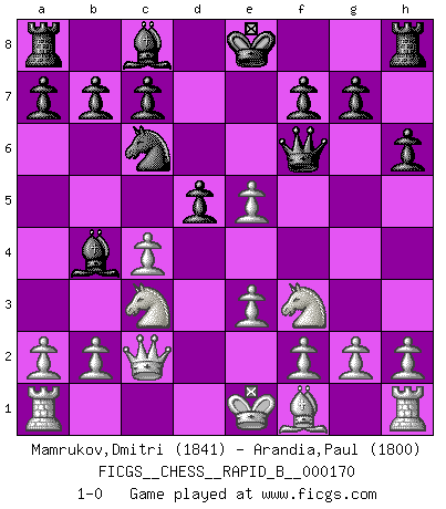 Last move : 1-0 2011 February 15 22:35:23 [Event "FICGS__CHESS__RAPID_B__000170"] [Site "FICGS"] [Date "2010.12.30"] [Round "1"] [White "Mamrukov,Dmitri"] [Black "Arandia,Paul"] [Result "1-0"] [WhiteElo "1841"] [BlackElo "1800"] 1.d4 d5 2.c4 e6 3.Nf3 Nc6 4.Nc3 Nf6 5.Bg5 Bb4 6.e3 h6 7.Bxf6 Qxf6 8.Qc2 e5 9.dxe5 1-0 This chess game has been lost on time (started : 2010.12.30 23:1:55) Queen's gambit declined Player White won this chess game. Follow this game move after move (download)No price is too great for the scalp of the enemy King. (Koblentz) Jeder weiß, dass Gasprom Putins persönliches Machtinstrument ist. Die Firma wird vom Kreml aus geleitet und wird schon deshalb nie transparent sein. (Garry Kasparov) El Ajedrez es un mar en el cual un mosquito puede beber y un elefante puede bañarse. (Refrán Hindú) Le jeu d'échecs fait naître et fortifie en nous plusieurs qualités précieuses dans le cours de l'existence, telles que la prévoyance, la circonspection, la prudence, et la persévérance. (Benjamin Franklin - 1783, la morale des échecs) There is no instance of a country having benefited from prolonged warfare. (Sun Tzu)