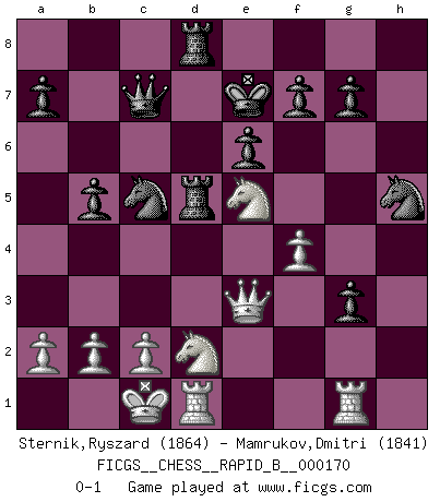 Last move : 0-1 2011 January 13 21:36:47 [Event "FICGS__CHESS__RAPID_B__000170"] [Site "FICGS"] [Date "2010.12.30"] [Round "1"] [White "Sternik,Ryszard"] [Black "Mamrukov,Dmitri"] [Result "0-1"] [WhiteElo "1864"] [BlackElo "1841"] 1.e4 c6 2.d4 d5 3.Nc3 dxe4 4.Nxe4 Bf5 5.Ng3 Bg6 6.h4 h6 7.Nf3 Nd7 8.h5 Bh7 9.Bd3 Bxd3 10.Qxd3 e6 11.Bf4 Qa5+ 12.Bd2 Bb4 13.Ne4 Ngf6 14.Nd6+ Ke7 15.Nc4 Bxd2+ 16.Nfxd2 Qc7 17.O-O-O Rhd8 18.g4 c5 19.dxc5 Nxc5 20.Qf3 Rd4 21.g5 hxg5 22.Qe2 Rad8 23.Rhg1 g4 24.f3 g3 25.Qe3 b5 26.Ne5 R4d5 27.f4 Nxh5 0-1 Caro-Kann : Classical, 7...Nd7 Queenside Castling by player White (move 17) Player Black won this chess game. Follow this game move after move (download)I thought the most common mistake [in chess] was the first one: Learning the game :P (Garvin Gray, FICGS forum) Ein typischer, sehr verbreiteter Gedankenschädling ist der, daß der betreffende Amateur von der Annanhme ausgeht, daß jeder einzelne Zug etwas zu leisten habe. (Aaron Nimzowitsch) El ganador de una partida es aquel jugador que hace el penúltimo error. (Savielly Tartakover) L'action d'une oeuvre littéraire se déroule sur un champ de bataille. Les masques et les types du drame moderne correspondent aux pièces du jeu d'échecs. L'intrigue correspond aux coups et aux gambits, c'est à dire aux techniques du jeu telles qu'utilisées et interprétées par les joueurs. Les tactiques et les péripéties [mouvements] correspondent aux coups exécutés par l'adversaire. (Viktor Shklovsky) Mac users swear by their computers. PC users swear at their computers. (Author unknown)