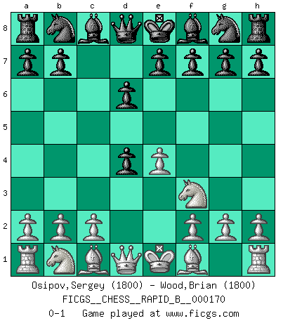 Last move : 0-1 2011 January 3 7:1:18 [Event "FICGS__CHESS__RAPID_B__000170"] [Site "FICGS"] [Date "2010.12.30"] [Round "1"] [White "Osipov,Sergey"] [Black "Wood,Brian"] [Result "0-1"] [WhiteElo "1800"] [BlackElo "1800"] 1.e4 c5 2.Nf3 d6 3.d4 cxd4 0-1 Sicilian Player Black won this chess game. Follow this game move after move (download)We must make sure that Chess will not be like a dead language, very interesting, but for a very small group. (Sytze Faber) Frage: Gibt es etwas was Sie mehr lieben als Autobahnen ohne Tempobegrenzungen? - Antwort: Deutsche Frauen ohne Tempobegrenzungen. (Loek van Wely) Jugadores de primera clase pierden en contra de jugadores de segunda clase porque los jugadores de segunda clase a veces juegan una partida de primer clase. (Siegbert Tarrasch) Les Echecs mettent en conflit, non pas deux intelligences, mais deux volontés. (Lasker) The problem with troubleshooting is that trouble shoots back. (Anonymous)
