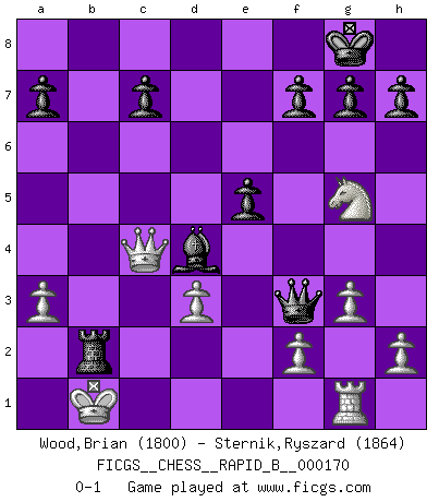 Last move : 0-1 2011 February 3 8:10:14 [Event "FICGS__CHESS__RAPID_B__000170"] [Site "FICGS"] [Date "2010.12.30"] [Round "1"] [White "Wood,Brian"] [Black "Sternik,Ryszard"] [Result "0-1"] [WhiteElo "1800"] [BlackElo "1864"] 1.c4 e5 2.Nc3 Nf6 3.g3 Bb4 4.Bg2 O-O 5.Qc2 Re8 6.d3 Nc6 7.Bxc6 bxc6 8.a3 Bf8 9.Nf3 d5 10.Bg5 Bh3 11.O-O-O Qd6 12.Bxf6 Qxf6 13.cxd5 Bg2 14.Rhg1 Bxf3 15.exf3 cxd5 16.Nxd5 Qxf3 17.Nc3 Bc5 18.Ne4 Bd4 19.Qc4 Rab8 20.Rd2 Rb6 21.Kb1 Reb8 22.Ng5 Rxb2+ 23.Rxb2 Rxb2+ 0-1 English : Bremen, Smyslov system Kingside Castling by player Black (move 4) Queenside Castling by player White (move 11) Player Black won this chess game. Follow this game move after move (download)Fischer is under obligation to nobody. (Joseph Platz) Ein unbeabsichtigtes Patt ist der Gipfel der Dummheit. (Anonymous) Botvinnik trataba de restarle el misterio al Ajedrez, siempre relacionandolo a situaciones de la vida ordinaria. El gustaba de llamar al Ajedrez un típico problema inexacto similar a aquellos de los cuales la gente siempre tiene que enfrentarse en la vida cotidiana. (Garry Kasparov) Nous vivons dans un monde échiquéen : chaque jour qui passe est un défi à relever. (Philosophe Sasha) I teach you to lie, cheat and steal, and as soon as my back's turned you wait in line ? (Gregory House, House M.D.)