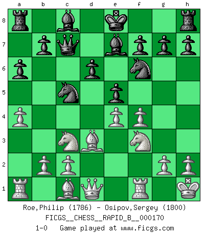 Last move : 1-0 2011 January 2 21:5:19 [Event "FICGS__CHESS__RAPID_B__000170"] [Site "FICGS"] [Date "2010.12.30"] [Round "1"] [White "Roe,Philip"] [Black "Osipov,Sergey"] [Result "1-0"] [WhiteElo "1786"] [BlackElo "1800"] 1.e4 c5 2.Nf3 d6 3.d4 cxd4 4.Nxd4 Nf6 5.Nc3 a6 6.f4 e5 7.Nf3 Nbd7 8.a4 Qc7 9.Bd3 Be7 10.O-O Nc5 11.Kh1 1-0 Sicilian : Najdorf, 6.f4 Kingside Castling by player White (move 10) Player White won this chess game. Follow this game move after move (download)A good sacrifice is one that is not necessarily sound but leaves your opponent dazed and confused. (Rudolph Spielmann) Bis jetzt ist Weiß einer wohlbekannten Analyse gefolgt. Aber jetzt begeht er einen schrecklichen Fehler: Er beginnt seinen eigenen Kopf zu benutzen. (Siegbert Tarrasch) Al jugar al Ajedrez entonces, podemos aprender: Primero: Previsión... Segundo: Prudencia... Tercero: Cautela... Y al final, aprendemos del Ajedrez el hábito de no ser desanimados por apariencias malas presentes en el estado de nuestros asuntos, el hábito de la esperanza por una oportunidad favorable y la perseveración de los secretos de los recursos. (Benjamin Franklin) L'attaque fait le spectacle, la défense gagne les matchs. (Dicton footballistique) Lottery : A tax on people who are bad at math. (Author unknown)