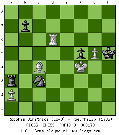 Last move : 1-0 2011 April 22 19:33:38 [Event "FICGS__CHESS__RAPID_B__000170"] [Site "FICGS"] [Date "2010.12.30"] [Round "1"] [White "Ropokis,Dimitrios"] [Black "Roe,Philip"] [Result "1-0"] [WhiteElo "1848"] [BlackElo "1786"] 1.d4 Nf6 2.Nf3 d6 3.c4 g6 4.Nc3 Bg7 5.e4 O-O 6.Be2 e5 7.O-O Nbd7 8.Be3 Re8 9.Qc2 exd4 10.Nxd4 c6 11.Rad1 Qe7 12.f3 a5 13.Qd2 a4 14.Nc2 Bf8 15.Bf4 Ne5 16.Bg5 Be6 17.Ne3 Ned7 18.Ned5 Bxd5 19.cxd5 h6 20.Bxh6 Bxh6 21.Qxh6 cxd5 22.Nxd5 Nxd5 23.Rxd5 Nf6 24.Rg5 d5 25.h4 Qc5+ 26.Kh1 Qf8 27.Qxf8+ Kxf8 28.Bb5 Re6 29.exd5 Rb6 30.d6 Rxd6 31.Rf2 a3 32.g3 Rd1+ 33.Kh2 axb2 34.Rxb2 Nd5 35.Be2 Rd4 36.Rg4 Rxg4 37.fxg4 Ra4 38.Bd1 Ra3 39.Bb3 Nf6 40.Kh3 Ne4 41.Rc2 Nd6 42.Rc7 g5 43.Rc5 Ne4 44.Rc8+ Kg7 45.Rc4 Nd6 46.Rc5 gxh4 47.gxh4 Ne4 48.Rc7 Nd6 49.g5 Kg6 50.Kg4 f5+ 51.Kf4 Nb5 52.Rd7 Nc3 53.Bf7+ Kg7 54.Bc4 Kg6 55.h5+ Kxh5 56.Rd6 1-0 Queen's pawn game Kingside Castling by player Black (move 5) Kingside Castling by player White (move 7) 10 pieces endgame at move 55 : White KRBPP , Black KRNPP WHITE : King + 1 Rook 1 Bishop 2 Pawns BLACK : King + 1 Rook 1 Knight 2 Pawns Player White won this chess game. Follow this game move after move (download)What is the difference between chess and football? Everybody understands football, but nobody plays it. Everybody plays chess, but nobody understands it. Everything is relative. (Vladimir Kramnik) Versuche, dich von der Sklaverei der Eröffnungsvarianten zu befreien. Stattdessen soll man gewisse Typenpositionen erlernen, die man eingehend analysiert. (Aaron Nimzowitsch) Con el fin de mejorar tu juego, debes de estudiar los finales antes que todo, ya que mientras que los finales pueden ser estudiados y dominados por sí mismos, el juegomedio y la apertura deben de ser estudiados en relación con los finales. (José Raúl Capablanca) Avant la finale, les dieux ont créé le milieu de partie. (Tarrasch) Are you threatening me, Master Jedi ? (Chancellor Palpatine in Star Wars ep.3)