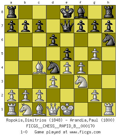 Last move : 1-0 2011 January 10 18:54:42 [Event "FICGS__CHESS__RAPID_B__000170"] [Site "FICGS"] [Date "2010.12.30"] [Round "1"] [White "Ropokis,Dimitrios"] [Black "Arandia,Paul"] [Result "1-0"] [WhiteElo "1848"] [BlackElo "1800"] 1.e4 e5 2.f4 d6 3.Nf3 Bg4 4.Bc4 Nh6 5.d3 Nc6 6.h3 Nd4 7.hxg4 Qe7 8.g5 1-0 King's gambit Player White won this chess game. Follow this game move after move (download)Place the contents of the Chess box in a hat, shake them up vigorously, pour them on the board from a height of two feet, and you get the style of Steinitz. (H. E. Bird) Nicht daß Diemer aus Opportunismus Mitglied der NSDAP geworden wäre. Er war ein Fanatiker, in allem, was er tat. (Hans Ree) El Ajedrez tiene tanto misterio como las mujeres. (Purdy) Les échecs, c'est l'art d'analyser. (Mikhail Botvinnik) There are lots of people who mistake their imagination for their memory. (Josh Bilings)