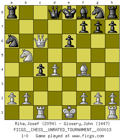Last move : 1-0 2011 January 2 20:19:39 [Event "FICGS__CHESS__UNRATED_TOURNAMENT__000013"] [Site "FICGS"] [Date "2010.12.30"] [Round "1"] [White "Riha,Josef"] [Black "Glosery,John"] [Result "1-0"] [WhiteElo "2094"] [BlackElo "1447"] 1.e4 e6 2.d4 a6 3.Nf3 b5 4.c4 Bb7 5.cxb5 Bxe4 6.Nc3 Bb7 7.bxa6 Nxa6 8.Bf4 c5 9.Nb5 Bxf3 10.Qxf3 d5 11.Rc1 c4 12.Bxc4 dxc4 13.Qc6+ 1-0 St. George defense Player White won this chess game. Follow this game move after move (download)A player surprised is half beaten. (Proverb) Im Schach gibt es keinen Platz für Galanterie. (Irving Chernev) La señal de un Gran Maestro es su habilidad de ganar una partida rápidamente y sin dolor. (Irving Chernev) Aucun coup ne doit être joué sans but. (Pedro Damiano) A cynic is a man who knows the price of everything but the value of nothing. (Oscar Wilde)